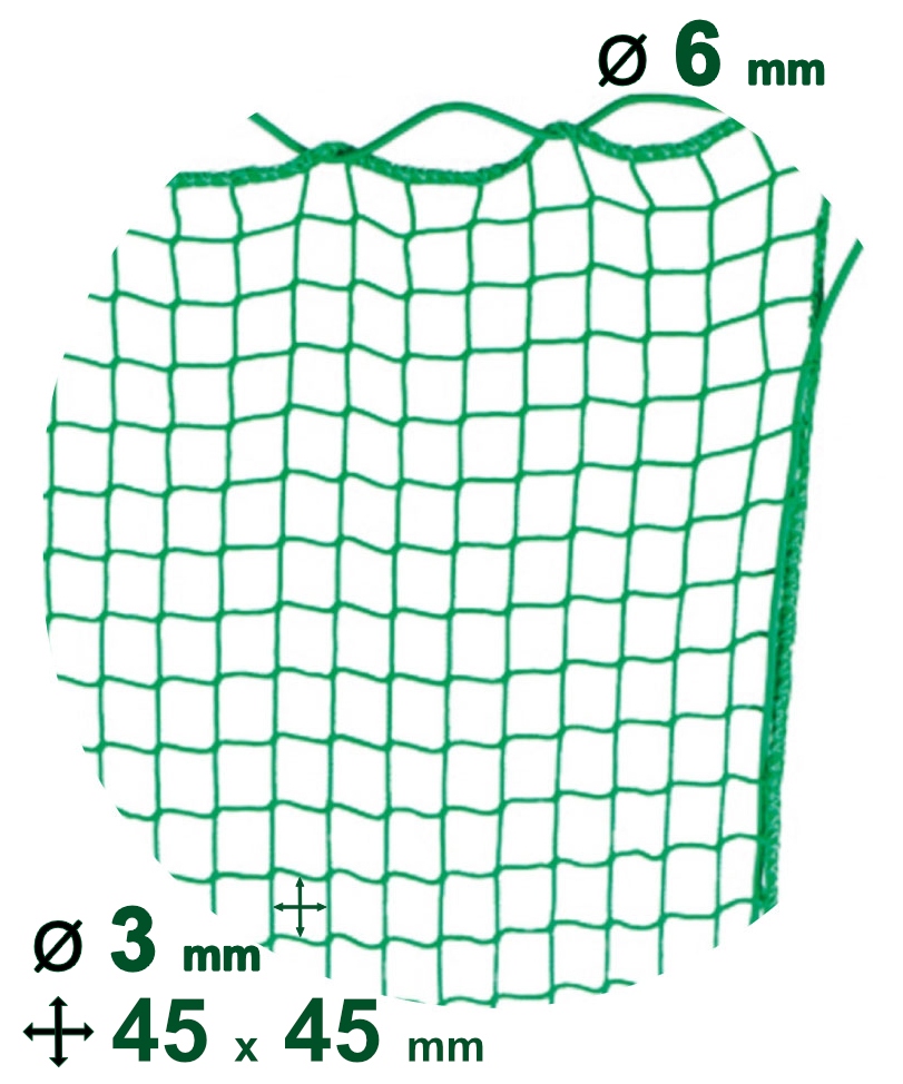 Durable Trailer & Flatbed Cargo NetFor the secure transport of small parts, loose cargo, and bulk itemsSuitable for flat lorry, containers, car and truck trailersElastic cord around the edge for a secure fitReinforced border for added durabilityHighly flexible, tear-resistant and UV-resistantGood abrasion resistance for long-lasting useDimensions: 1.5 x 2.5 mMaterial: Polypropylene (knotless)Mesh size: 45 mm x 45 mmMesh thickness: Ø 3 mmCord thickness: Ø 6 mmUsage: Securing loads, cargo space partitionColor: GreenApproved by DEKRA for quality and safety Information on product safety (Manufacturer, Contact)HELMUT FELDTMANN GmbH, Zunftstraße 28, 21244 Buchholz, 04181/2004-0,