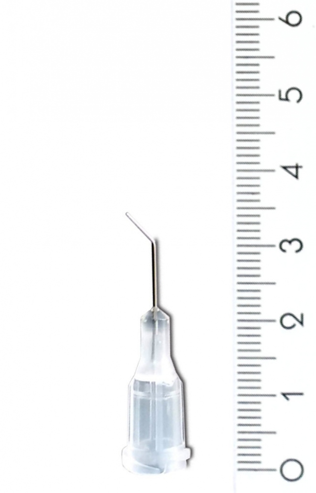 45° bent needle for torque sealant gun cartridgeLength (metal): 12.7 mmSuitable for: and Diameter: 0.21 mmColor: transparentPressure: 6.8 barBent nozzles – bent angle 45° – are suitable for dispensing bad access places. Plastic hub has stainless steel nozzle in length 1/2. This premier line of dispensing needles is burr-free, and electro-polished shaft for unobstructed and consistent material flow. In addition they are silicone and chloride free. Designed to dispense most viscosity fluids and adhesives and safe for use to 6,8 bars (100 psi). Double helix connection ensures safe fitting to luer lock bottle, syringes, valves, luer lock mixer MA5,4–24 etc. Information on product safety (Manufacturer, Contact)E.I.S. Euro Industry Supply GmbH & Co. KG, Heilbronner Str. 150, 70191 Stuttgart, GERMANY, +49 (0) 711 460 59 21 40, , www.euro-industry.com