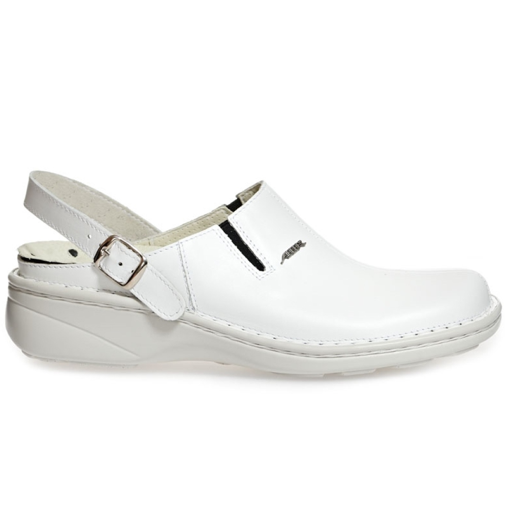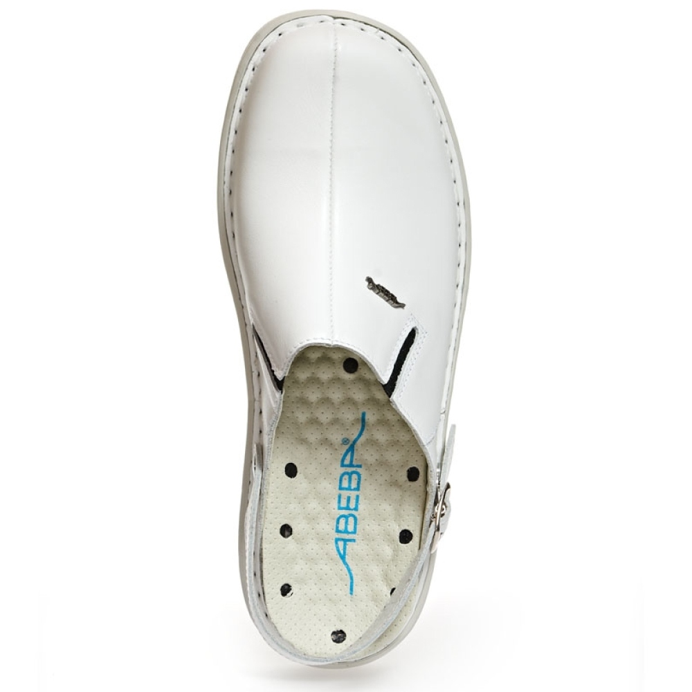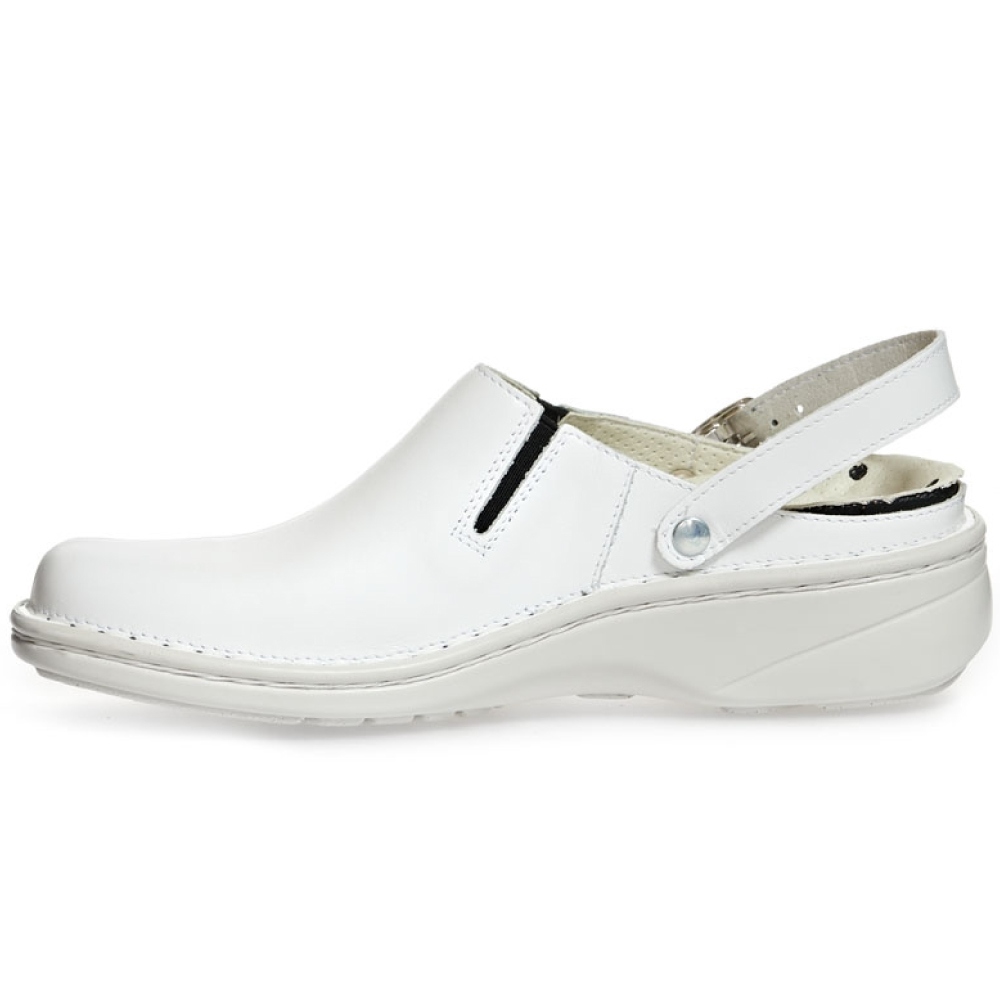 Technical DataStandard: CE, EN ISO 20347:2012, A, E, SRB, ESD dissipative according to DIN EN 61340Material: Smooth leatherColor: whiteSafety class: OBToe cap: noWalking Sole: Non-slip PU walking soleInsole: 2 replaceable Reflexor® insoles (article no. / )Size: 36-42CharacteristicsHeel strap foldable, adjustableLining microfiber, respiration absorbingInstep area with elastic bandBuckle fasteningHand-sewn seam
