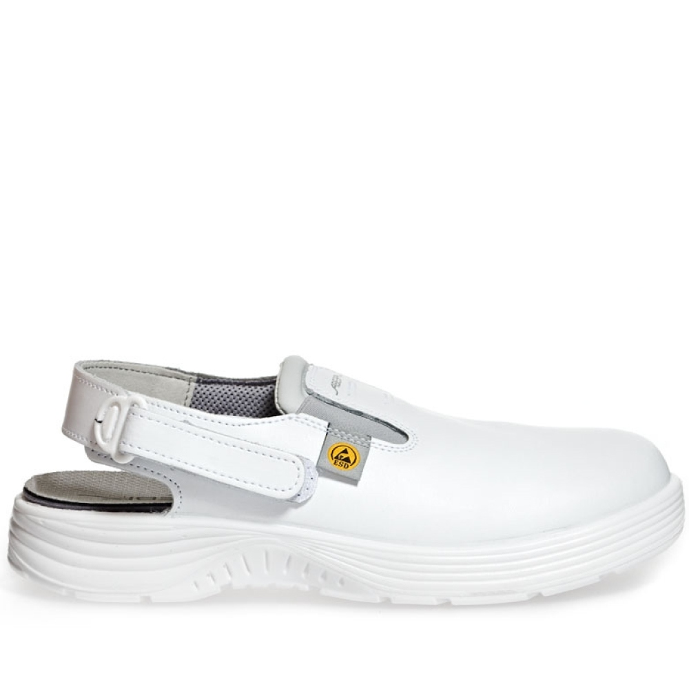 Technical DataStandard: CE, EN ISO 20345:2012, SB, SRCMaterial: Smooth leatherColor: whiteWalking Sole: Slip resistance PU outsole soleInsole: Replaceable Active Comfort Insole (art. 351720)Safety class: SBToe cap: YesSize: 35-48CharacteristicsSanitized treated (reducing odor and germs)ESD dissipative according to DIN EN 61340Heel strap non-foldable, adjustableBreathable lining with Silver ionsInstep area with elastic bandVelcro fastening*Certification for ORTHOstat sole submitted