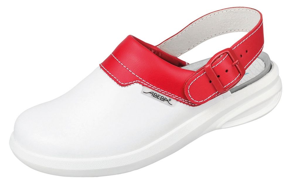 Technical DataStandard: CE, EN ISO 20347:2012, A, E, FO, SRC, TÜV GS-tested safety DIN 4843 part 100 paragraph 3.1v.8/93Material: Smooth leatherColor: white/ redSafety class: OBToe cap: noWalking Sole: Non-slip TPU walking soleInsole: Replaceable acc Wave insole (article no. )Size: 35-43CharacteristicsSanitized treated (reducing odor and germs)AntistaticHeel strap non-foldable, adjustableSuitable for hygienically demanding areas