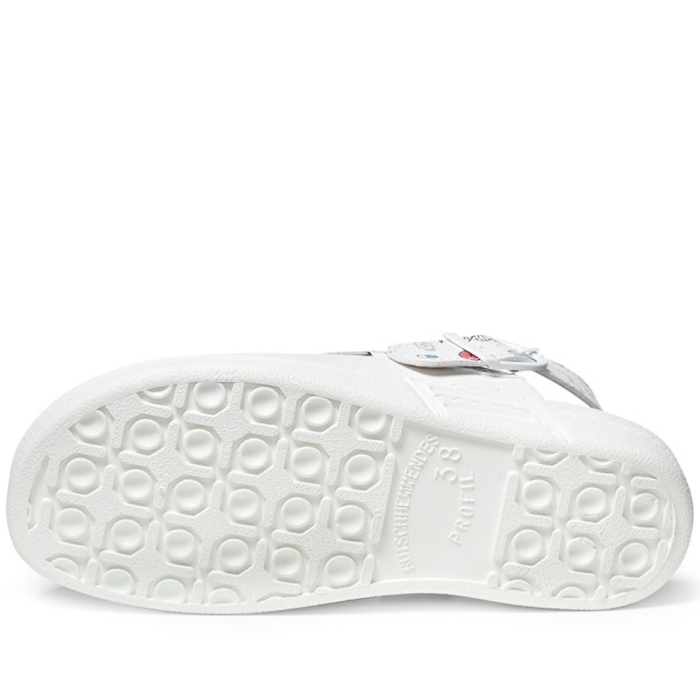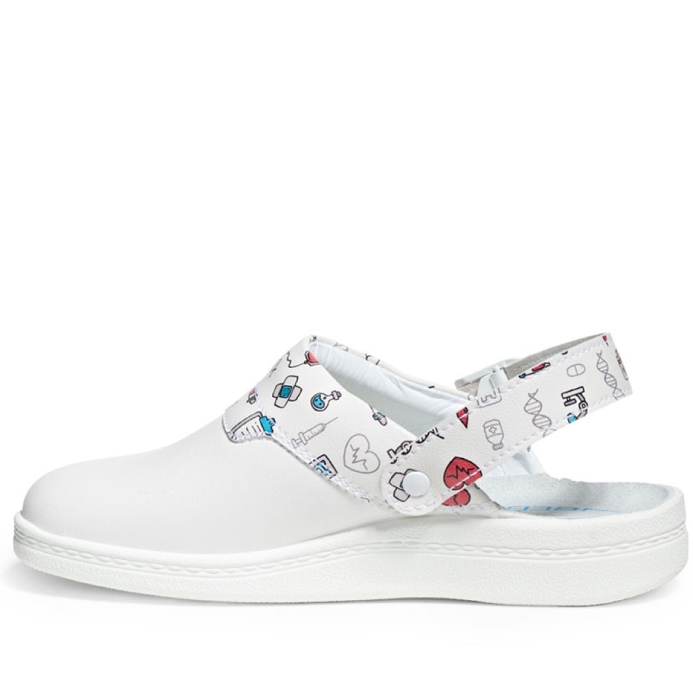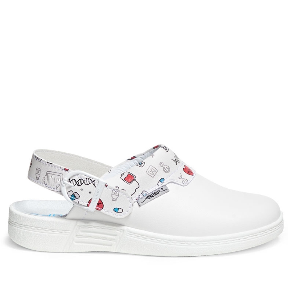 Technical DataStandard: CE, EN ISO 20347:2012, OB, E, FO, SRCMaterial: MicrofibreColor: WhiteWalking Sole: Slip resistance TPU outsole soleSafety class: OBToe cap: NoSize: 35-43Weight (39): 880 gCharacteristicsSanitized treated (reducing odor and germs)AntistaticHeel strap foldable, adjustableMicrofiber heel patch