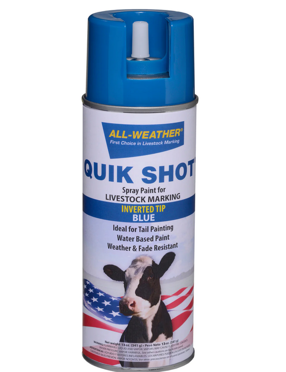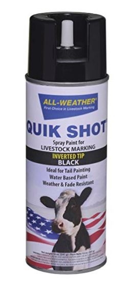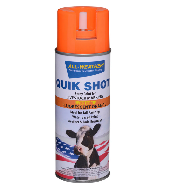 The All-Weather Quik Shot is a quick drying and long lasting spray for cows. Additional InformationClean to use with no wasteFast drying paint for longer lasting identificationNon-toxic, safe for all livestockComes in regular and fluorescent colorsMade in the U.S.AVolume 450g (16 oz)GHS Label elements, including precautionary statementsGHS labellingHazard pictograms (GHS) :