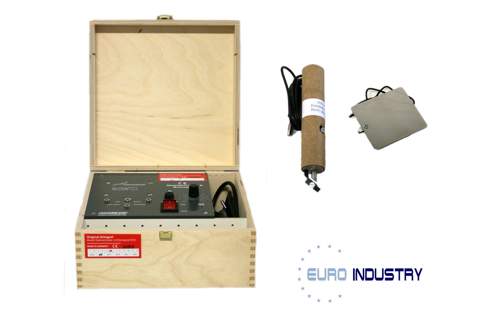 The electric-Etcher will mark metals parts, using the writing-pen.Only conductive materials can be engraved with the Etching-Pen Arkograf.Voltage 230 V, 50 Hz, for 6 lettering sizes. Suitable for thicker letteringThe parts to be engraved should be free of lubricants, rust, scale or other dirt.The electrical engraving machines work with an oscillating electrode, according to the light arc short circuit principle.The devices consist of: Special transformer for 1-8 V secondary voltage, with on / off switch, control lamp, approx. 1 m connecting cable with earthing contact plug, writing pencil and 3 electrodes of 1.2 x 25 mm for steel and metals, base plates and a wooden box.ARKOGRAF ORIGINAL NO. 70040 – MADE IN GERMANY Information on product safety (Manufacturer, Contact)E. Schäfer Vertrieb, Talstraße 7, 73650 Winterbach, GERMANY, +49 7181 4855-0, , www.e-schaefer.de