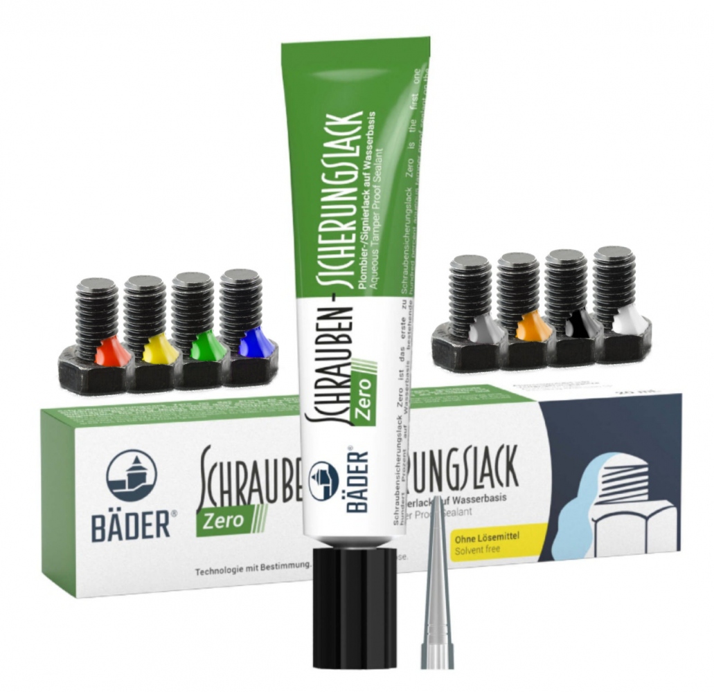 Bäder® Greenmark® Zero water base torque sealant tamper-proof – no solventsHealth & environmentally friendly for your business. Can be shipped worldwide without dangerous goods surcharge!(tamper proof sealant) of Lackfabrik Bäder GmbH & Co. KG is the reference since 1962 in the market of tamper proof sealants and has been used millionfold in small, medium, large and global industrial companies for years. Like the Standard Bäder torque sealant, Bäder Zero is an essential tool to protect and seal involving all kinds of screw securing jobs. It is the first 100% water-based securing lacquer system that works completely without organic solvents (VOCfree) which leads to a significant health risk minimization for the user during its processing. The color is food safe and can be used in the food-processing industry.Application fieldsQuality controlProduction’s controlProduct controlTamper proofScrew safetyMechanical engineeringPrecision EngineeringAutomotive IndustryElectronicsAviationAuthenticity protectionSealingCharacteristicsThis Bäder thread lock lack is the indispensable tool for securing, marking and sealing metal pieces.Clean and fast work thanks to the precise long nozzleZero is an aqueous lacquer system based on a specially chosen combination of polymers. It does not contain an organic solvents (VOC-free).This paint is certified for use in the food industryWater resistantOil-resistantPetrol resistantResistant to dilute acids and alkalisVOC-freeNote: Because it is VOC-free the product can be shipped worldwide without dangerous goods surcharge !Technical specificationsIt can be used without problems at temperatures between until 90° C.Solubility in water: InsolubleState at 20°C: Viscous/liquidDensity at 20°C: ca. 1,05 g/cm³MAC: Not applicableIgnition temperature: Not applicableRisk of fire and explosion: Not applicableOrdinance on hazardous substances (Gefahrstoffverordnung/Germany): This mixture is not classified as hazardous according to Regulation (EC) 1272/2008 [GHS].Transport information: No dangerous goods as defined by the transport regulations – ADR/RID, IMDG, ICAO/IATA-DGR.Conditions for safe storage: Store under cool and dry conditionsISO certified: DIN EN ISO 9001: 2008Shelf life: Shelf life at room temperature (20° C) is min. 6 monthsVolume 20mlColors: yellow, red, blue, green, whiteContent of deliveryAluminum tube in cartonIncluding a plastic extension nozzleGreenmark® ‑ Zero Range – Aqueous tamper proof sealantThe Zero Range (aqueous tamper proof sealant) from Lackfabrik Bäder GmbH & Co. KG is the first 100% water-based securing lacquer system that works completely without organic solvents (VOCfree). In addition to its excellent adhesive properties, it has good breaking properties and a drying speed that is phenomenal for water-based systems. Furthermore, it is not a hazardous material, which leads to a significant risk minimization for the user during its processing. Our Zero Range is the essential tool to protect, mark, fill and seal work involving all kinds of screw securing jobs. It is used for quality assurance and to safeguard against manipulation in machine-building, precision-engineering, the automotive industry and electronics.The sub-brand Greenmark® comprises all marking systems of Lackfabrik Bäder GmbH & Co. KG, which are free of hazardous substances and have a particularly gentle effect on people and the environment. It is the result of Bäder®‘s strategic decision to rely largely on high-performance water-based marking systems for new developments and thus to decisively improve the ecological footprint. The Zero range marks the beginning and will be completed by further high-performance systems this year and in the coming year. PropertiesWithout organic solventsWater-basedInsulatingGood media resistanceIndustry specificationsBoeing-Specification BMS8 45 Type IIRolls Royce Specification MSRR1102Bosch Norm 2580-1 Information on product safety (Manufacturer, Contact)Lackfabrik Bäder GmbH & Co. KG, Dieselstraße 34, D-73734 Esslingen/Neckar, +49 (0) 711/381607, , lackfabrik-baeder.de