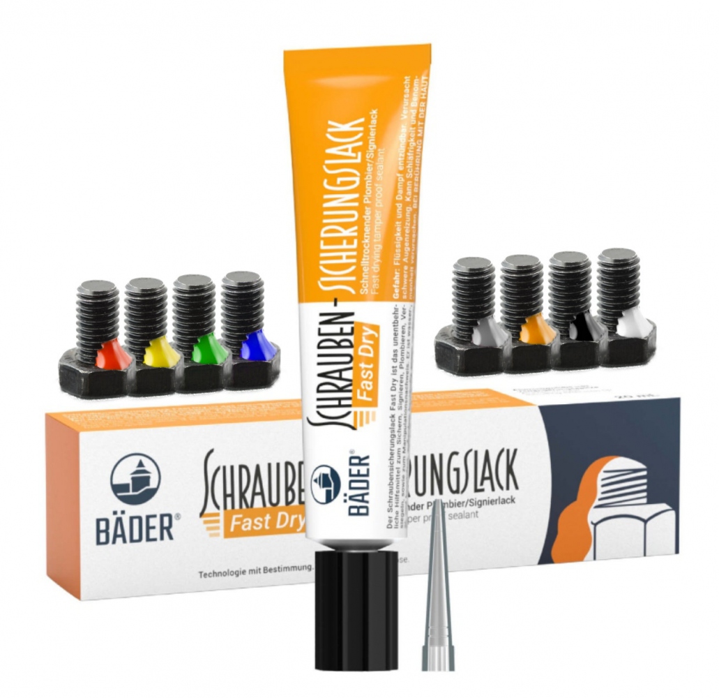 Bäder torque seal tamper-proof Fast DryDries 5 times faster than conventional torque sealants – Ideal for overhead or vertical applications and pieceworkThis torque sealant (tamper proof sealant) of Lackfabrik Bäder GmbH & Co. KG is extremely fast drying. It has an excellent anti-flow behavior and good adhesion properties.StandardsUV- and weather-resistant for min. 3 years (and counting) according to DIN EN ISO 2810CharacteristicsExtremely fast dryingExcellent anti-flow behaviourInsulatingGood media and chemical resistanceWater resistantOil-resistantPetrol resistantResistant to dilute acids and alkalisVolume 20mlIt can be used without problems at temperatures between -30 ° C and 100 ° C.Colors: yellow, red, white, blue, green, grey, black, pink, orangeIncluded in deliveryAluminum tube in cartonIncluding a plastic extension nozzleField of applicationQuality controlProduction’s controlProduct controlTamper proofScrew safetyMechanical engineeringPrecision EngineeringAutomotive IndustryElectronicsAviationAuthenticity protectionSealingOverhead & workPieceworkIndustry specificationsAirbus Specification ECS‑L 2274Boeing Specification BMS8 45 Type IIRolls-Royce Specification MSRR1102Bosch-Norm 2580–1Safran Specification HMDC6002Technical specificationsViscosity: 20,000 – 30,000 mPasVOC value: 520 g/L ±20 g/L (may vary slightly depending on color)Processing temperature: -20° C – 35° CTemperature stability: -80° C – 125° CFlash point: -4° CDust dry: after approx. 1 min**Fully cured: after approx. 24 hours**Density: approx. 1.05 g/cm3Shelf life: 1 year, cool stored up to 5 yearsLooking for a more health & environmentally friendly alternative with the same properties? is the world’s first water-based torque sealant. It is odorless and can be shipped overseas without dangerous goods surcharges. Find out more !Hazards (CLP)Signal word: DangerHazard Statements (H-phrases)H225: Highly flammable liquid and vapour.H319: Causes serious eye irritation.H336: May cause drowsiness or dizziness.Precautionary Statements (P-phrases)Prevention:P210: Keep away from heat, hot surfaces, sparks, open flames and other ignition sources. No smoking.P243: Take action to prevent static discharges.P261: Avoid breathing vapours.P264: Wash hands thoroughly after handling.P271: Use only outdoors or in a well-ventilated area.P280: Wear protective gloves and eye/face protection.Response:P303+P361+P353: IF ON SKIN (or hair): Take off immediately all contaminated clothing. Rinse skin with water [or shower].P304+P340: IF INHALED: Remove person to fresh air and keep comfortable for breathing.P305+P351+P338: IF IN EYES: Rinse cautiously with water for several minutes. Remove contact lenses, if present and easy to do. Continue rinsing.P312: Call a POISON CENTER or doctor if you feel unwell.P337+P313: If eye irritation persists: Get medical advice/attention.P370+P378: In case of fire: Use dry chemical powder or sand to extinguish.Storage:P403+P233: Store in a well-ventilated place. Keep container tightly closed.P403+P235: Store in a well-ventilated place. Keep cool.P405: Store locked up.Supplementary HazardsEUH066: Repeated exposure may cause skin dryness or cracking.×Hazardous materials. The forwarding charges may be raised, if shipping to: DE, AT, NL, GB, CH, CZ, IT, ES, FI, NO, BE, IE, RO, PL, FR, PT, LU, DK, LI, GR, SE, SK, BG, SI, CA, LT, EE, LV, HR, SA, Information on product safety (Manufacturer, Contact)Lackfabrik Bäder GmbH & Co. KG, Dieselstraße 34, D-73734 Esslingen/Neckar, +49 (0) 711/381607, , lackfabrik-baeder.de