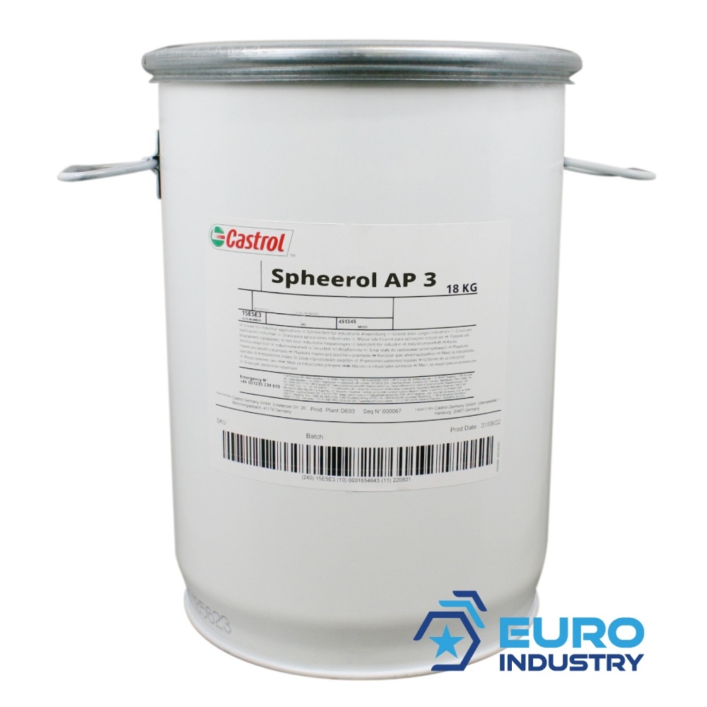 Castrol Spheerol AP 3 is a lithium-based grease incorporating solvent-refined base oils (NLGI 3). They contain oxidation and corrosion inhibitors, which help to ensure long service life and a high level of protection for metal surfaces. The greases are water-resistant.Volume: 18kg bucketAlso available in: , 50kg barrelApplicationSpheerol AP 2 and AP 3 are primarily intended for use in plain and anti-friction , ball and roller bearings besides other machinery applications. They are recommended for use under normal load conditions, within an operating temperature range of -20°C to +120°C. Due to the low viscosity used in these products, they are particularly suitable for high speed bearings.AdvantagesCorrosion inhibitor additives ensure protection of metal surfaces extending bearing life.Oxidation inhibitors extend the life of the grease in high temperature applications minimising the need for regreasing.Water resistance ensures good levels of protection in wet applications.Technical specificationsThickener type: Lithium soapConsistency NLGI Grade: 3Colour: Amber/BrownTexture: Smooth & homogenousOperating temperature: -20 to +120Dropping point °C/°F: 180min/356 minBase Oil Viscosity @ 40°C / 104°F mm²/s: 100-130Worked Penetration (60 strokes @ 25°C / 77°F) 0.1 mm: 220-250GLIS number: 14F57EMSDS code: 451345 Information on product safety (Manufacturer, Contact)BP Europa SE, Erkelenzer Straße 20, 41179 Mönchengladbach, GERMANY, +49 800 7235 074, , www.bp.com