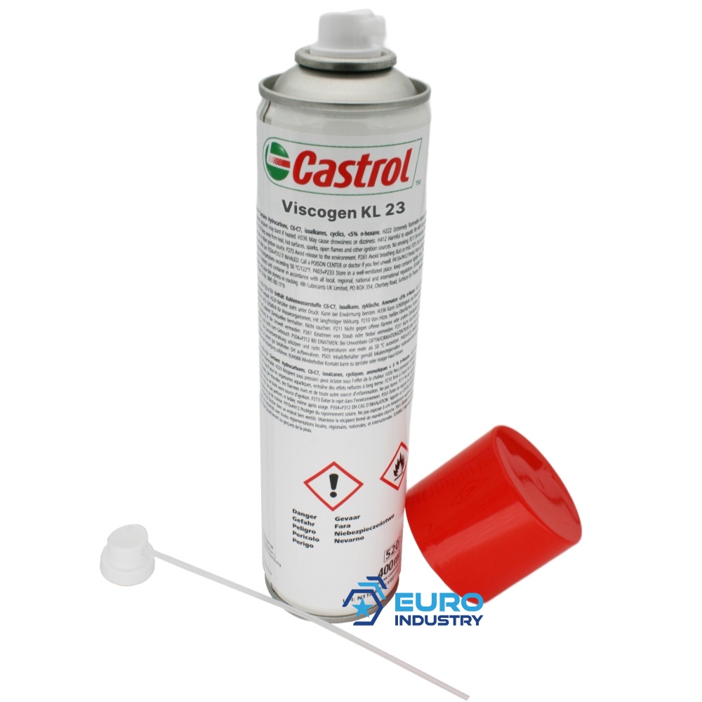 Castrol Viscogen KL 23 Spray – High temperature chain lubricantCastrol Viscogen™ KL range are thermally stable synthetic lubricants designed for high temperature lubrication in severe environments, where the use of mineral oils or conventional synthetic oils would result in excessive wear, carbonisation and residue formation. They can be used up to temperatures of +240°C/+464°F, depending on the viscosity. Viscogen KL have been developed from base fluids which form exceptionally adherent, transparent and odourless lubricating films and an additive system free of solids, metals or silicone which enhances load carrying capability and wear protection.ApplicationViscogen KL is available in six different viscosities depending on the ambient and operating conditions.The dimensions of the chain as well as its structural shape (e.g. roller, pin, ladder chains, insertion and flat link hoisting chains) are important when selecting the right viscosity. The way the lubricant is applied must also be considered e.g. manual lubrication, drip feed lubricator, central lubrication, sump lubrication or via spray can. Viscogen KL finds use in many industrial applications, for example: High-rack storage shelves, bakery machines, paint lines, conveyor chains, tenter frames and dryers, washing plants, underfloor chains, steamers, slashers, baking ovens, slide ways, spindles, ropes, open gear wheels, plastic toothed belts and sheet-fed offset machines. AdvantagesExtremely low evaporation rate, low residue formation and low smoke generation at high temperatures – enabling reduced maintenance, reduced lubricant consumption and better working environments.High load carrying ability under severe mechanical loads and high temperatures as well as excellent penetration on chains and wire rope strands – leading to longer chain life.No dripping or throwing off at high speeds or high temperatures – giving reduced lubricant consumption.Excellent rust protection, extraordinary oxidation resistance and no hard carbon build up – leading to longer chain life and reduced maintenance.Technical specificationsColour: greenBase Oil: Synthetic oilDensity at 15°C: 950 kg/m3Viscosity at 40°C: 249Viscosity at 100°C: 23Flash Point – open cup method: 240°CPour Point: -39°CVolume: 400ml spray canAlso available in: 20l canister, 55l barrel, 208l barrelGLIS number: 15E1B9MSDS code: 452266Hazard Information (CLP)Signal word: DangerUFI: 90W0-50SF-400E-GN09Hazard Statements (H-phrases)H222, H229: Extremely flammable aerosol. Pressurized container: May burst if heated.Prevention (P-phrases)P210: Keep away from heat, hot surfaces, sparks, open flames and other ignition sources. No smoking.P211: Do not spray on an open flame or other ignition source.P251: Do not pierce or burn, even after use.StorageP410 + P412: Protect from sunlight. Do not expose to temperatures exceeding 50 °C/122 °F. ×Hazardous materials. The forwarding charges may be raised, if shipping to: DE, AT, NL, GB, CH, CZ, IT, ES, FI, NO, BE, IE, RO, PL, FR, PT, LU, DK, LI, GR, SE, SK, BG, SI, CA, LT, EE, LV, HR, SA, Information on product safety (Manufacturer, Contact)BP Europa SE, Erkelenzer Straße 20, 41179 Mönchengladbach, GERMANY, +49 800 7235 074, , www.bp.com