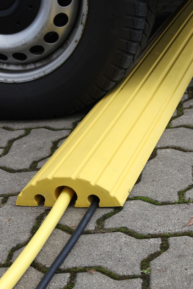Crash Stop 20010 Traffic cable bridge / protector, yellow, 1500 mm Quick solution to protect cables and pipesFor traffic areas (roads, pedestrian areas, parking lots, events…)Ideal in industrial facilities (warehouses, construction areas…)The profiled shape slows down the sliding for a quick passage.The materials used are highly resistant, even in cold weather.Different variations can be used depending on the need.Technical dataMaterial: Rubber / PVCWeight: 13,2 kgSize: 1500 x 210 x 65 mmMaximum load capacity: 40tColor: yellow3 cable/hose passages with a maximum diameter of 40mm (1 x Ø 40 mm and 2 x Ø 20 mm) Information on product safety (Manufacturer, Contact)Dancop International GmbH, Wilhelm-Rausch-Strasse 15, 31228 Peine-Stederdorf, GERMANY, +49 5171 585690, , www.dancop.com