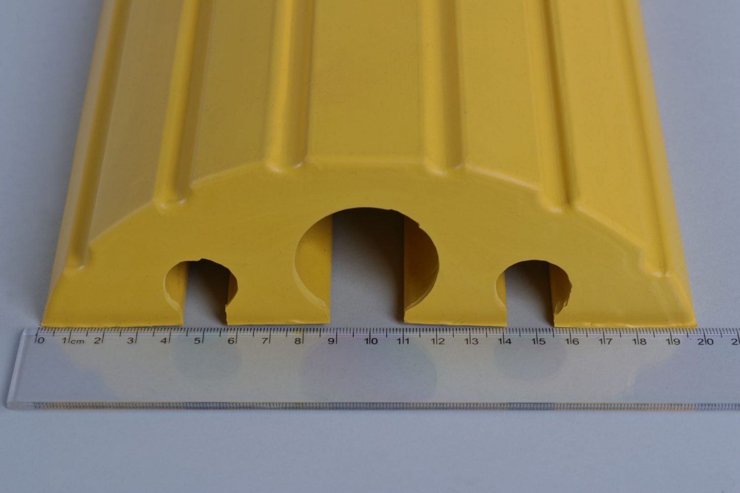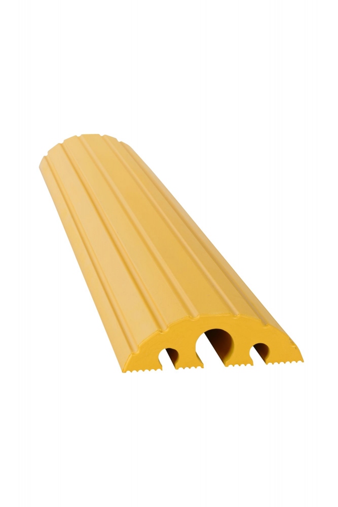 Traffic cable bridge / protector, yellow, 1200 mm Quick solution to protect cables and pipesFor traffic areas (roads, pedestrian areas, parking lots, events…)Ideal in industrial facilities (warehouses, construction areas…)The profiled shape slows down the sliding for a quick passage.The materials used are highly resistant, even in cold weather.Different variations can be used depending on the need.Technical dataMaterial: Rubber / PVCWeight: 12,5 kgSize: 1200 x 210 x 65 mmMaximum load capacity: 40tColor: yellow3 cable/hose passages with a maximum diameter of 40mm (1 x Ø 40 mm and 2 x Ø 20 mm) Information on product safety (Manufacturer, Contact)Dancop International GmbH, Wilhelm-Rausch-Strasse 15, 31228 Peine-Stederdorf, GERMANY, +49 5171 585690, , www.dancop.com