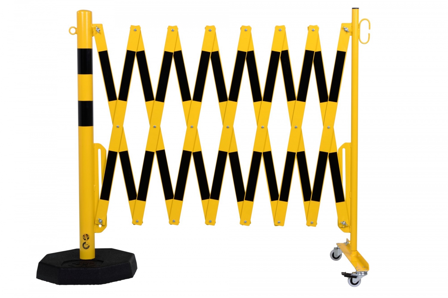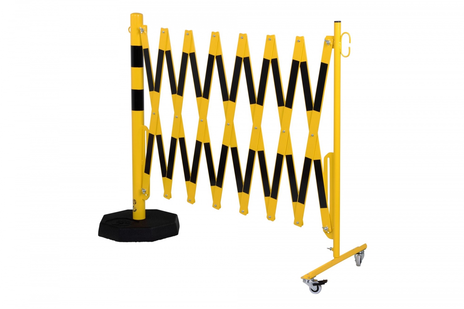 CRASH STOP 70-90 Expandng barrier with castors and heavy foot plate, yellow-black, 4000 mmExpanding Barrier, steel, 1050 mm H, powder coated, with castors, with post Ø 60 mm on a mobileoctagonal foot plate, TÜV-certified (Folded width incl. footplate)Technical DataModel: 70-90Material: SteelWidth: 4000 mmHeight: 1050 mmFolded width total (ca.): 620 mmMaterial flat steel: 5 x 40 mmWeight: 30,0 kgDescriptionThe variation with combined steel posts can be positioned in areas where wall fixings are not possible.Like the TÜV-certified expanding barriers with wall fixings these combined sets are also available inyellow-black and red-white in the standard lengths of 3.6 m and 4.0 m.The steel barrier posts are for floor mounting with base plate, rectangular posts 70 x 70 mm orround posts (diameter 60 mm). For existing barrier posts, it is possible to use the KIT version with an adaptor.For temporary use, the barrier post can be combined with the mobile base plate including the expanding barrier. Information on product safety (Manufacturer, Contact)Dancop International GmbH, Wilhelm-Rausch-Strasse 15, 31228 Peine-Stederdorf, GERMANY, +49 5171 585690, , www.dancop.com