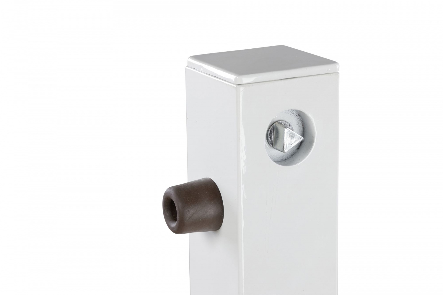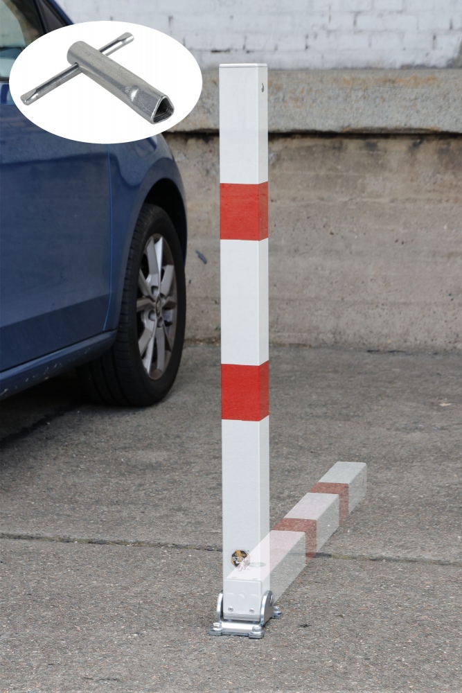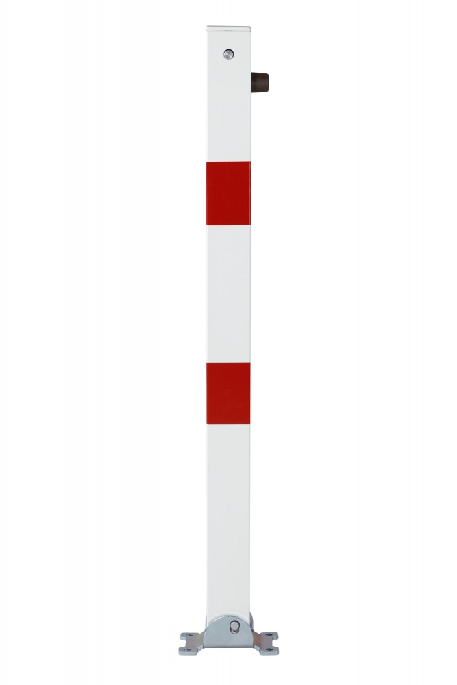 CRASH STOP 90-10 Foldable parking post, with base plate, square, with triangular lock (key not included)Folding parking post, red-white, galvanised, height 1000 mm, with red reflecting foilTechnical DataModel: 90-10Material: Steel, galvanisedsquare 70 x 70 mmHeight: 1000 mmWeight: 7,7 kgDescriptionThe foldable parking barriers and locking posts for flipping over are a fast and uncomplicated way to secureparking areas and drive-through areas against unauthorized use. The versions can be bolted or concreted.There is also the possibility to lock the versions with a padlock or with an integral lock.The conspicuous white-red colour with red reflecting foil allows a fast detection of the barrier to prevent damage.In the folded state, the parking barriers and locking posts can be passed without problems.The fixing material is not included in the delivery. Information on product safety (Manufacturer, Contact)Dancop International GmbH, Wilhelm-Rausch-Strasse 15, 31228 Peine-Stederdorf, GERMANY, +49 5171 585690, , www.dancop.com