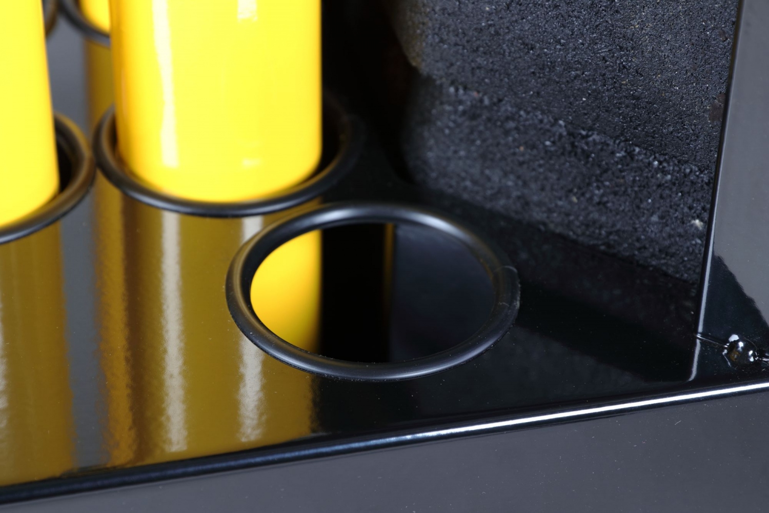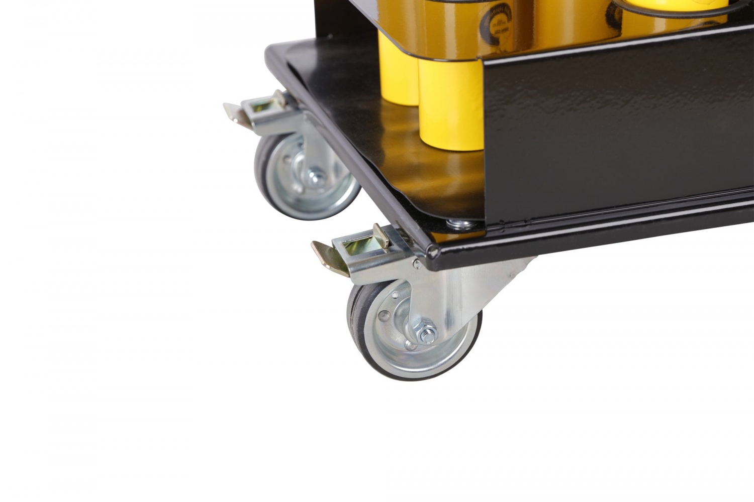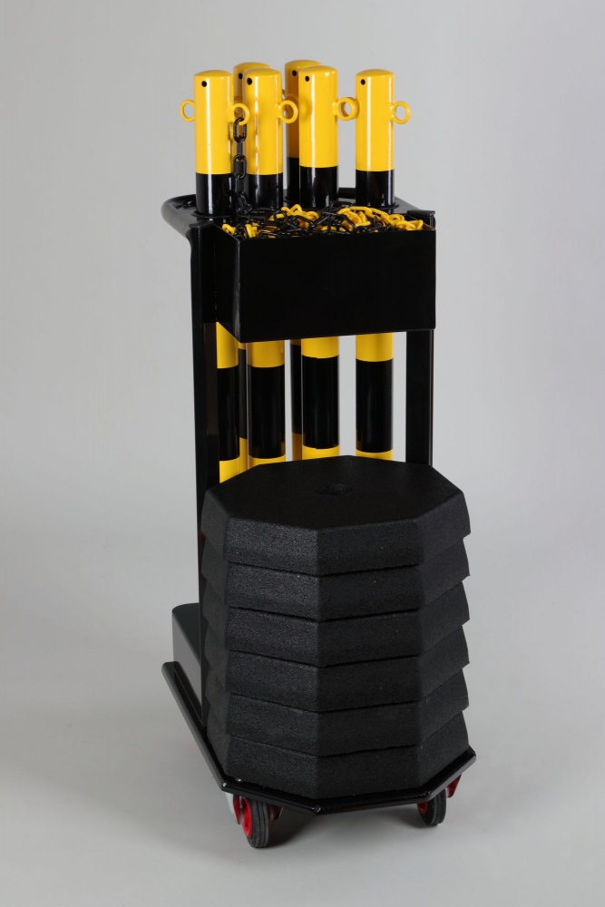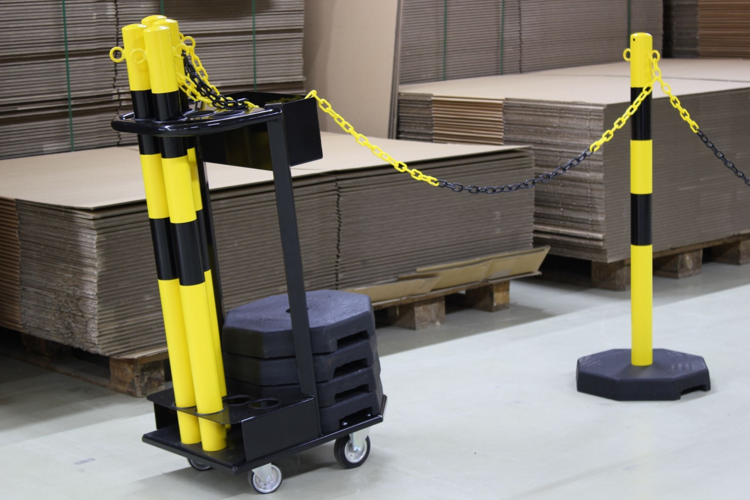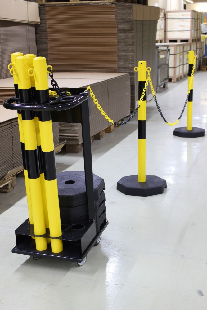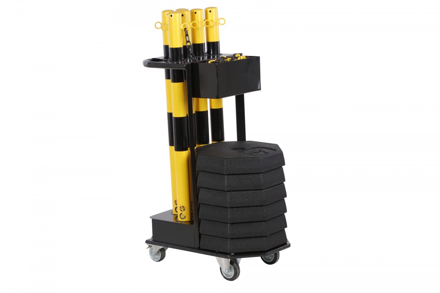 CRASH STOP KPS-TG-GS Chain post set (6 pcs) with Transport Rack, yellow-blackTransport Rack and Heavy Duty Chain Post Set: transport rack, 6 x galvanized and powdercoated steel posts with eyelets (Ø 60 mm, height: 1000mm), 6 x octagonal recycled rubberfoot plates 7 kg each, 25 m polyethylene chainTechnical DataMaterial: Steel / RubberHeight: 1000 mmWeight: 92,0 kgDescriptionThe Transport Rack for the chain post set is the best solution to carry and store the single chain posts.The easy handling and transport of the single components of the chain post set to the operation site becomespossible by the pre-assembled wheels.The set of chain posts consists of six posts, (60 mm diameter, height 1000 mm, with eyelets) mobile base plates (8 kg)and a basic polyethylene chain with a total length of 25 m. The set of chain posts is available in red-white with redreflecting foil and in yellow-black. Information on product safety (Manufacturer, Contact)Dancop International GmbH, Wilhelm-Rausch-Strasse 15, 31228 Peine-Stederdorf, GERMANY, +49 5171 585690, , www.dancop.com