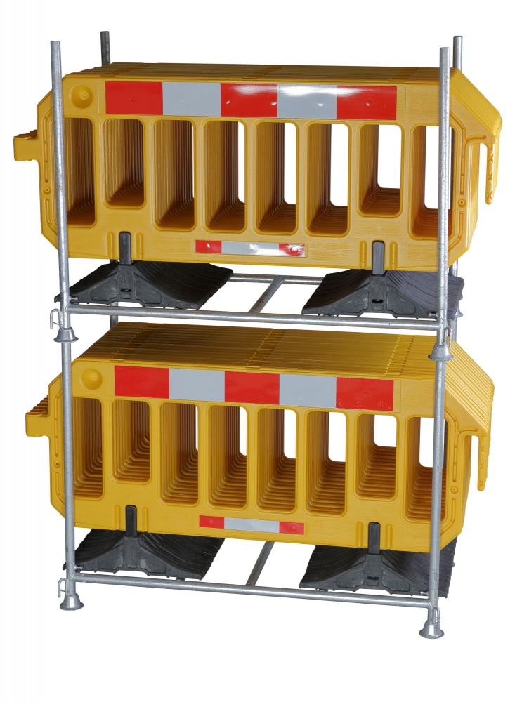 Storage and transport rack, galvanised, stackable, lifting possible by lifting truck, forklift truck or crane,for safety the undercarriage is equipped with a spring ring when used on the craneTechnical DataMaterial: polyethylene, galvanized steelSet Rack: 2000 x 820 x 1250 mmSet Weight: 275,5 kgRack: 1700 x 820 x 1250 mm, 47,2 kgBarrier fence: 2000 x 1000 x 50 mm, 15,2 kgDescriptionThe barrier fences are the perfect solution for blocking off and marking of obstacles.The solid and big feet are constructed for a solid standing and due to the hook-and-eye elementthe fences can be used as per your needs either in line or at angles.For storage and for easy transport the feet can be turned.White and yellow Type: with red-white retroreflective RA 1 foil Information on product safety (Manufacturer, Contact)Dancop International GmbH, Wilhelm-Rausch-Strasse 15, 31228 Peine-Stederdorf, GERMANY, +49 5171 585690, , www.dancop.com
