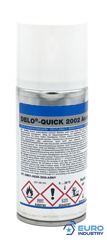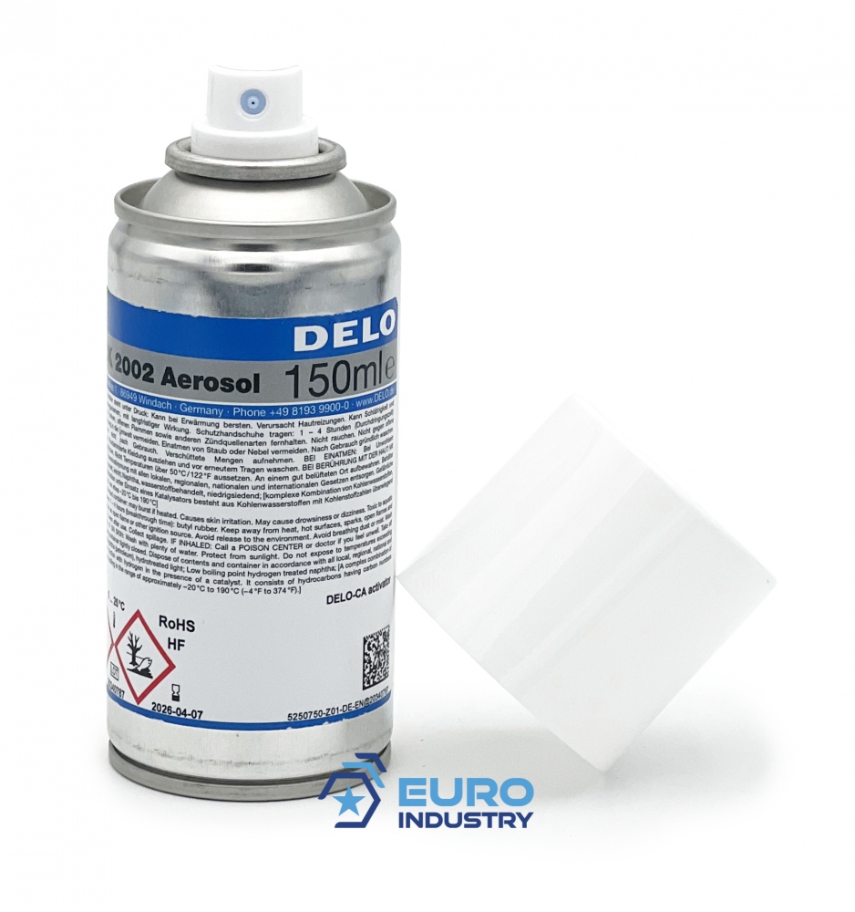 Delo QUICK 2002 Activator for CyanoacrylatesField of applicationFor the reliable and fast curing of DELO-CA adhesivesSuitable for all DELO-CA adhesivesCan also be used as cleaner for the surfaces to be bonded BaseHydrocarbon mixtureCFC- and CF-freeProcessingPretreat one of the surfaces to be bonded, preferably the more porous respectively less dense one, with the activatorLet the solvent evaporate completelyAdhesive application and joining of the componentsIn special cases, both bonding surfaces can be pretreatedIn case of open bondings or in boundary areas, the activator can also be sprayed onto the adhesive subsequentlyIn case of low-viscous products, dispense sparingly, otherwise overreactions (foaming of the adhesive) can be initiatedFor subsequent treatment, high-viscous DELO-CA adhesives respectively propolyester-based cyanoacrylates are best suitableThe behavior of lacquered surfaces and thermoplastics towards DELO-QUICK 2002 should be tested where required Technical specificationsVolatiles [%]: 99VbF class: A I Evaporation time [min] at room temperature (approx. 23 °C): approx. 2 Storage life at room temperature (max. 25 °C) in unopened original container: 12 monthsHazard Statements (CLP)Signal word: DangerHazard Statements (H-Sentences)H225: Liquid and vapor highly flammable.H301: Toxic if swallowed and enters airways.H314: Causes skin irritation.H336: May cause drowsiness or dizziness.H400: Very toxic to aquatic life with long-lasting effects.Precautionary Statements (P-Sentences)Prevention:P280: Wear protective gloves.P210: Keep away from heat, sparks, open flames, and other ignition sources.P260: Do not smoke. Avoid release to the environment.Response:P301+P310: IF INHALED: Immediately call a POISON CENTER or doctor.P303+P361+P353: IF ON SKIN: Wash with plenty of water.Other Relevant InformationProduct must not be released into waterways.×Hazardous materials. The forwarding charges may be raised, if shipping to: DE, AT, NL, GB, CH, CZ, IT, ES, FI, NO, BE, IE, RO, PL, FR, PT, LU, DK, LI, GR, SE, SK, BG, SI, CA, LT, EE, LV, HR, SA, Information on product safety (Manufacturer, Contact)DELO Industrie Klebstoffe GmbH & Co. KGaA, DELO-Allee 1, 86949 Windach, GERMANY, +49 8193 9900-0, , www.delo.de