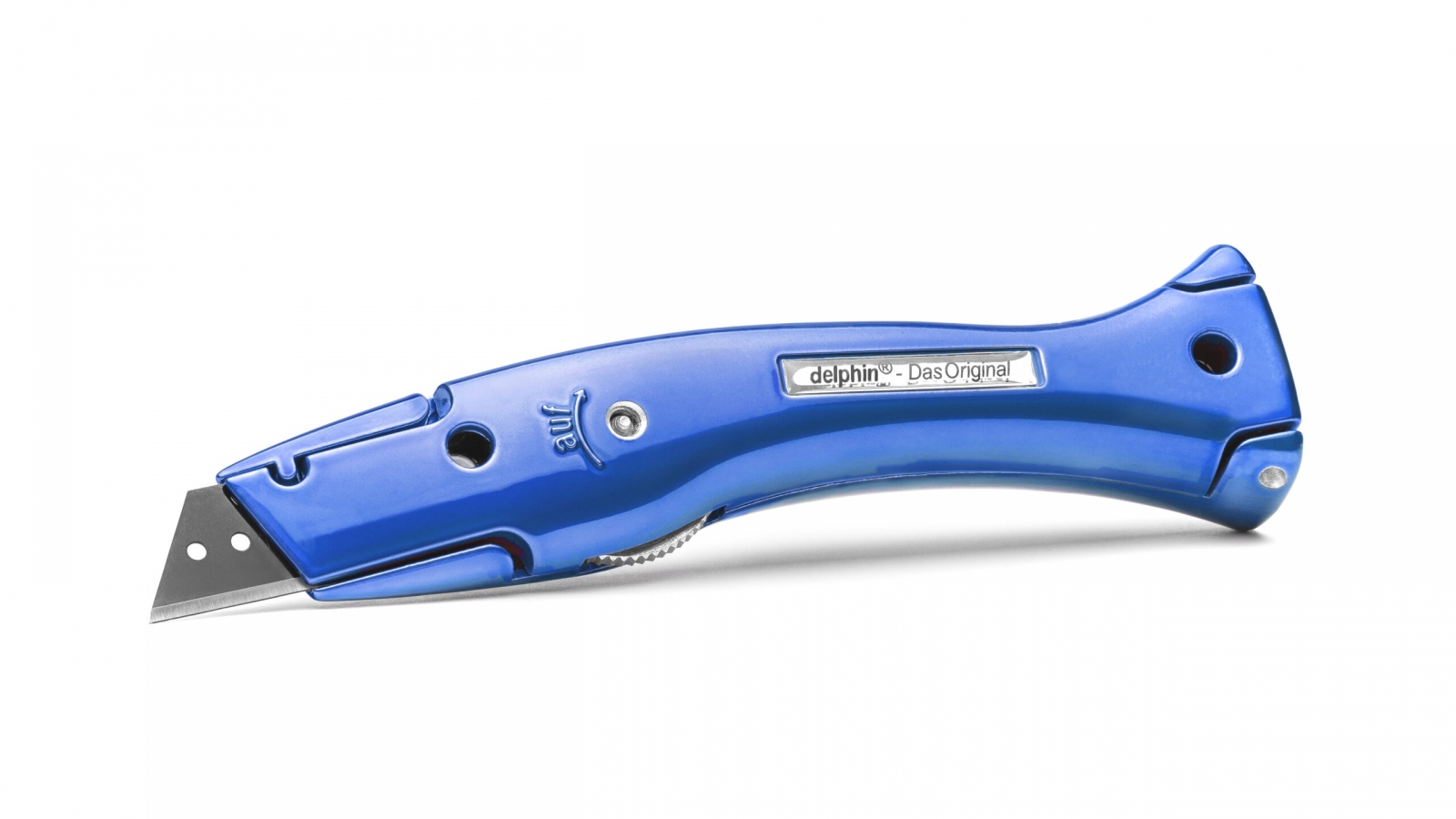 Perfectly suitable to cut through packing material, bituminous sheeting, roofing felt, carpet, pvc-flooring, pvc-foil, styrofoam and insulating material.Quick blade change by innovative closure system.Aluminium housing.The knife is supplied with a holster to clip on to belts or pockets.This is the world’s most popular carpet fitters knife and features the following details – easy opening, no screwdriver needed, great ergonomic shape with a very positive and comfortable grip.The knife also features an internal magnet to prevent the blade from falling out and a separate holder within the tool for storing up to 10 blades.Color: candy ice blueWeight 154 gSize 18x5x4 cmAdvantagesOpening and closing without tools.Internal compartment blades.Magnetic Blade quiverSecurity through practical quiverFits all standard quivers.Fits all standard straight and hook blades.!!!!!MADE IN GERMANY!!!!!! Information on product safety (Manufacturer, Contact)Reddig GmbH, Bremer Strasse 7, 49457 Drebber, GERMANY, +49 5445 673, , www.delphinmesser.de
