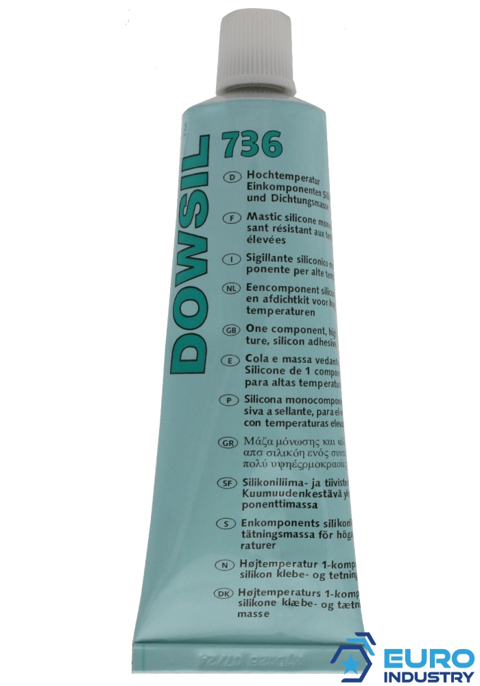 DOWSIL™ 736 is a one-component, heat-resistant silicone adhesive and sealant for industrial applications. It is permanently resistant up to 260 °C and can withstand short-term exposure to temperatures up to 315 °C.Pack size: 90 ml tubeAlso available in: ApplicationsSealing and encapsulation of heating elements in appliancesAerospace gasketingMoving oven beltsIndustrial ovensBag filters in smokestacksOther high-temperature applications in bonding, sealing, and coatingApprovals & CertificationsComplies with FDA Regulation 21 CFR 177.2600 (suitable for incidental food contact if extractive limits are met)Listed under NSF Standard 51 for direct food contactUL (Underwriters Laboratories) listedMeets MIL-A-46106 Rev. BFeaturesSingle-component silicone sealantNon-sagging and non-drippingCan be applied overhead or on vertical surfacesResistant up to 260 °C in continuous operation, short-term up to 315 °CGood adhesion to many substrates; primer can improve adhesionResistant to water, oil, and many chemicalsSuitable SubstratesHeat-resistant materials such as siliconeRubber (recommended: roughen surface before application)Glass and ceramicsCertain plastics (test compatibility before use)Metals with corrosion-resistant surfaces (Not recommended for copper, brass, zinc, steel, galvanized iron, or magnesium.)Not recommended for: Polyethylene, polypropylene, PTFE, concrete, masonry, or highly oil-containing surfacesTechnical Data Temperature Range -65 °C to 260 °C Color Red Flow/Slump None Extrusion Rate (1/8 inch orifice, 90 psi) 390 g/min Specific Gravity 1.04 Skin-over Time 10 minutes Tack-free Time 17 minutes Cure Time (3 mm thickness) 24 hours Hardness, Shore A 26 Tensile Strength 350 psi Elongation 600 %Application InstructionsEnsure the surface is clean, dry, and free of grease. Use appropriate solvents such as acetone or isopropanol for cleaning.For improved adhesion on metal or plastic surfaces, a primer such as DOWSIL™ 1200 Prime Coat can be used.Apply the sealant evenly to the desired surface. A cartridge gun is recommended for precision application.Tooling should be completed within 5 minutes after application before a skin forms.Storage & Shelf LifeStore in a dry place in the unopened original packaging at temperatures, ideally between +5 °C and +30 °C. Avoid direct sunlight.Shelf life: At least 12 months from the date of manufacture. Information on product safety (Manufacturer, Contact)DOW DEUTSCHLAND ANLAGENGESELLSCHAFT MBH, Rheingaustr. 34, 65201 Wiesbaden, GERMANY, +49 611 237007, , www.dow.com