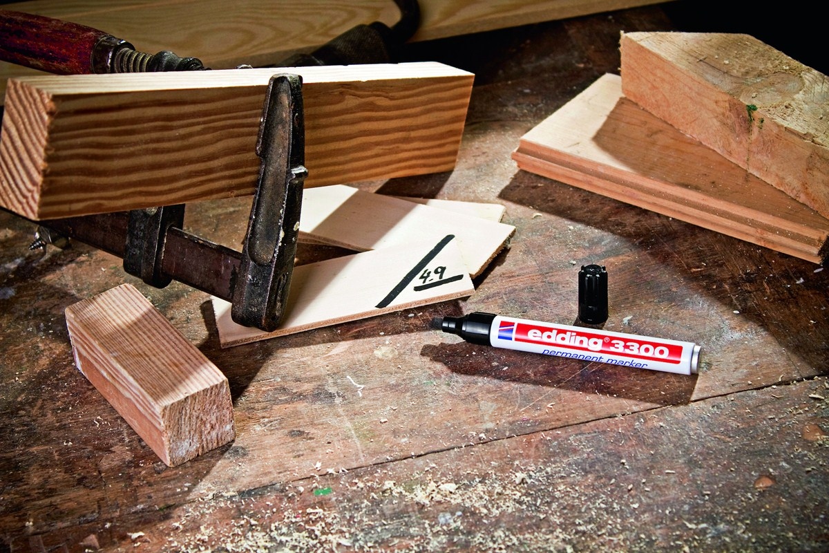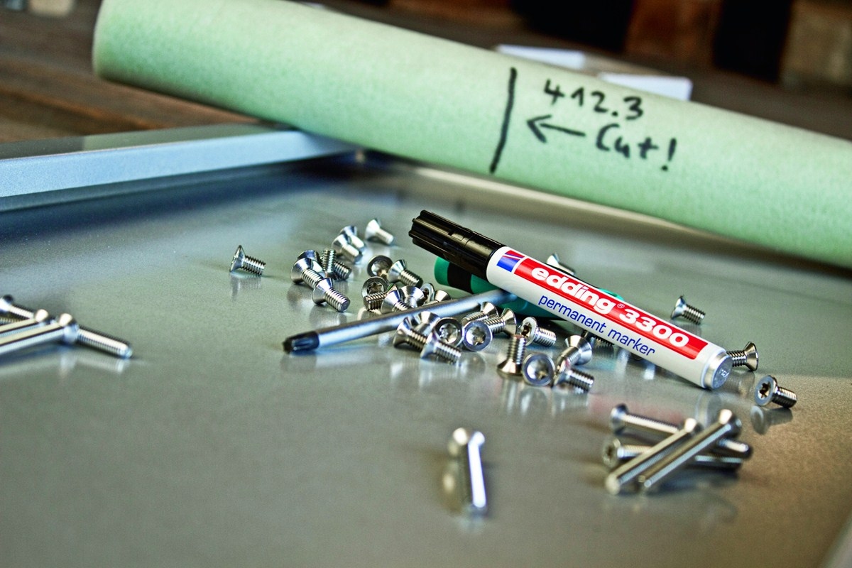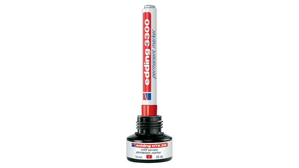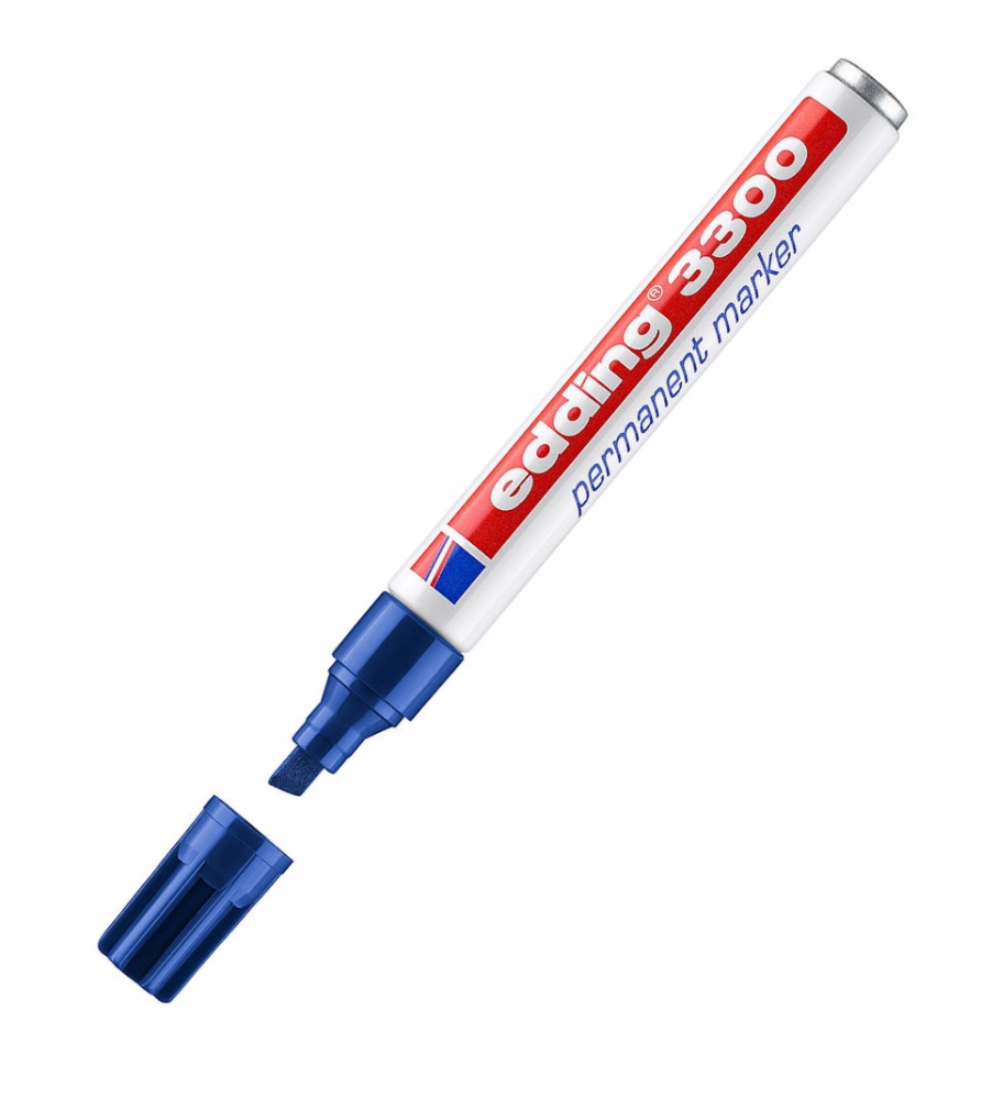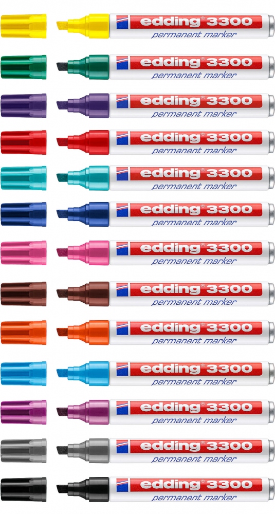 Refillable permanent marker with chisel nib for marking and labelling almost all materials, e.g. paper, cardboard, metal, plastic and glassThe chisel nib has a stroke width of 1-5 mmWaterproof and wear-resistant on almost all surfacesAvailable in 13 different coloursRefillable in the colours black, red, blue, green, yellow, orange, brown, violet, pink and light blue with edding T 25, T 100 and T 1000 refill inks and with edding MTK 25 refill serviceSuitable spare nibs (edding 3300 spare nibs) are availableLow-odour ink with no added toluene/xyleneHigh-quality aluminium barrelReady to useCap can be stored on the end of the barrel to prevent risk of losing itBroad colour assortmentHigh-quality brand productMade in Germany