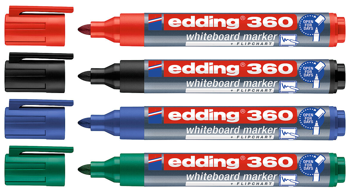 Whiteboard marker for writing and marking on whiteboards and also suitable for flipchartsEdding 360 Boardmarker Bullet Tip Set includes 4 colors – black, red, green, blueThe writing is dry-wipeable from virtually all non-porous surfaces such as enamel and melamineThe round nib has a stroke width of 1.5-3 mmThanks to the cap-off technology, the cap can be left off for several days without the product drying out (test climate according to ISO 554)The whiteboard marker ink is lightfast and quick-dryingRefillable in the colours black, red, blue and green with edding BTK 25 refill serviceSuitable spare nibs (edding 28/360 spare nibs) are availableWith no added butyl acetateMade in GermanySpecificationsShape of nib: round nibStroke width: 1.5-3 mmSpare nibs availableLow odourLightfastQuick-dryingRefillableCap can be repositionedhas clipRoll stopp present