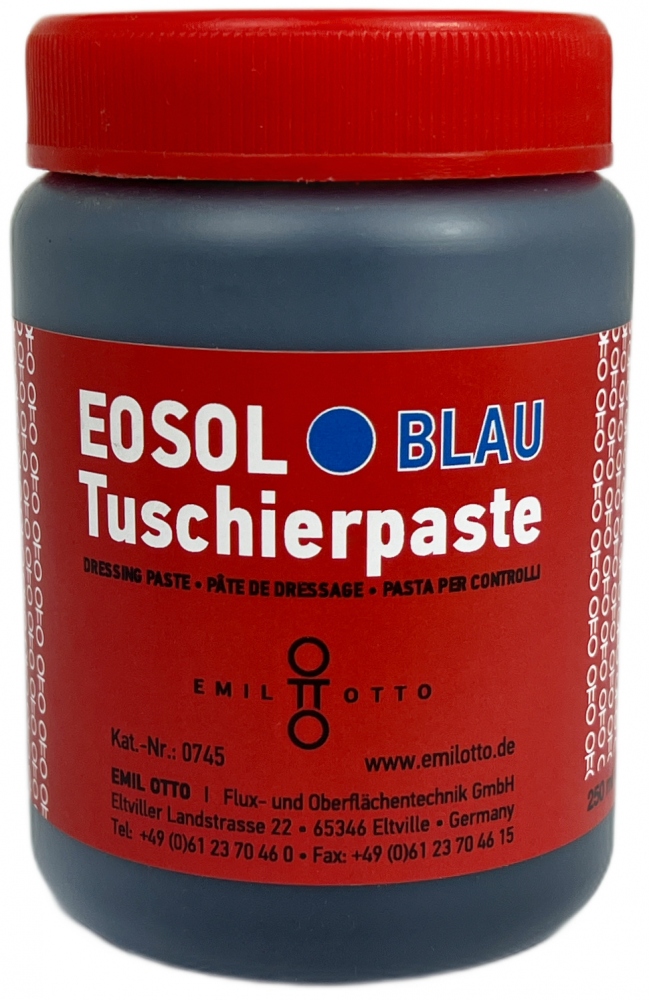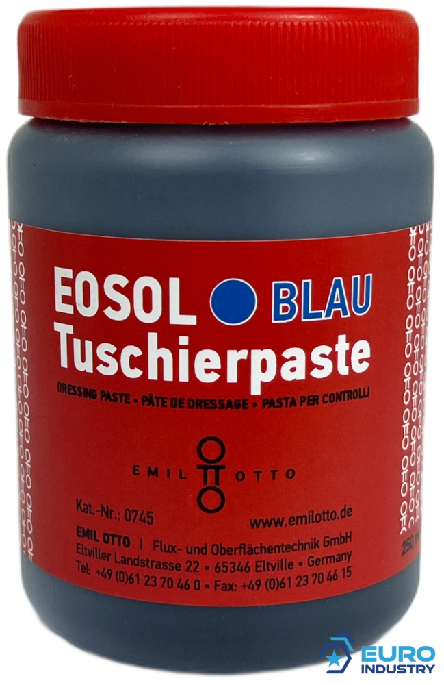 EOSOL Engineer’s marking paste for Surface Quality ChecksEOSOL surface pastes are highly efficient contrast mediums for identifying work piece contact patterns and for the inspection of mechanical work.Ready to useNo flakingMore precise and easier processing due to paste-like consistencyIncorporated special pigments enable more precise and easier control of the processed workpiecesEasy removal of the spotting paste with EOSOL Solvent A and EOSOL WBC Universal CleanerDoes not hardenHigh sliding and lubricating propertiesProtects against chemical attackCorrosion protectionPackaging unit: 250 ml canColors: BlueTechnical dataAppearance: Obtainable in red and blueDensity is: 1.125 g/mlDripping point: 50 °CTemperature range for application: 10 °C to 40 °CConsistency: PastyCritical temperatures: Below 0 °C and above 40 °C Information on product safety (Manufacturer, Contact)Emil Otto Flux- und Oberflächentechnik GmbH, Eltviller Landstraße 22, 65346 Eltville am Rhein, GERMANY, +49 6123 70 46-0, , www.emilotto.de