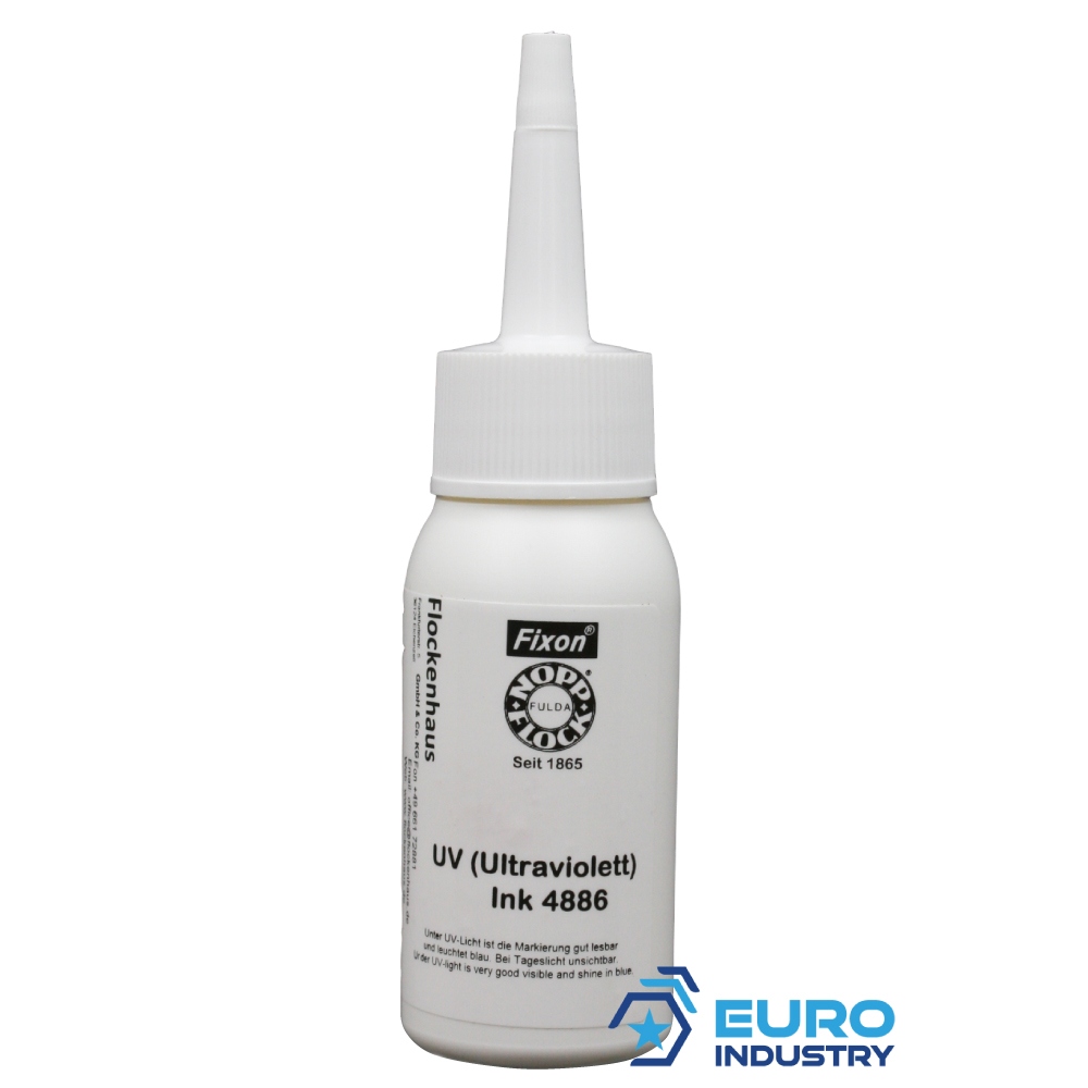 UV felt refill or can be used as a tampon inkWhen viewed under UV light (366 nm), it is easy to read and turns blue.Invisible in the light of day.For inscriptions on metal, glass, u. at. MaterialThe labeled surface must be free of dust and grease.Content: Bottle of 50 ml Information on product safety (Manufacturer, Contact)Flockenhaus GmbH & Co. KG, Frankfurter Str. 5, 36124 Eichenzell Fulda, GERMANY, +49 661 72881, , www.flockenhaus.de