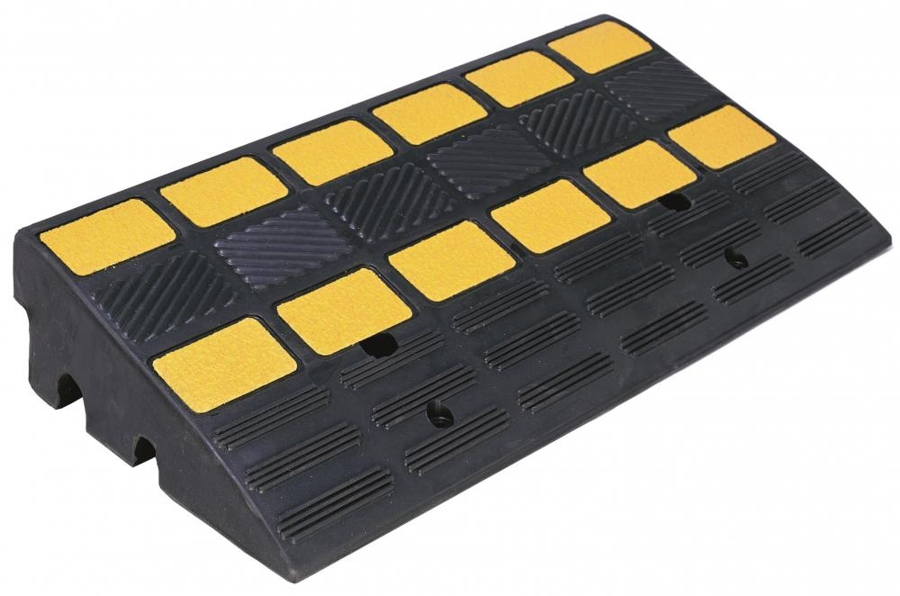 Curb Ramp, made of heavy duty rubber, 600 mm, black with yellow reflective warn tape, weight capacity: 40 tons,2 x cable tunnels: 1 x 30 mm and 1 x 25 mmTechnical DataMaterial: hard rubberWeight: 20,0 kgColor: black / yellowup to 40 tonsSize: 600 x 360 x 150 mmDescriptionThe curb ramps allow barrier-free use of sidewalks and ramps. Whether house or garage entrances or industrial areas – motor vehicles, bicycles, saddle carriages, wheelchairs or lifting trucks find easily hold on the profiled surface. The curb ramp can be additionally mounted fix in case of a permanent use. The channels located on the underside of the ramps serve as water drain or alternatively as a protection of cables.The material is resistant to environmental influences and allows a long-term use. Information on product safety (Manufacturer, Contact)HELMUT FELDTMANN GmbH, Zunftstraße 28, 21244 Buchholz, 04181/2004-0,