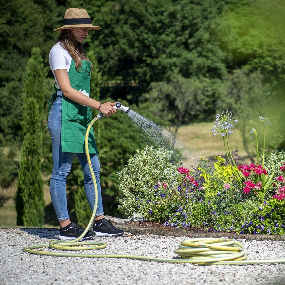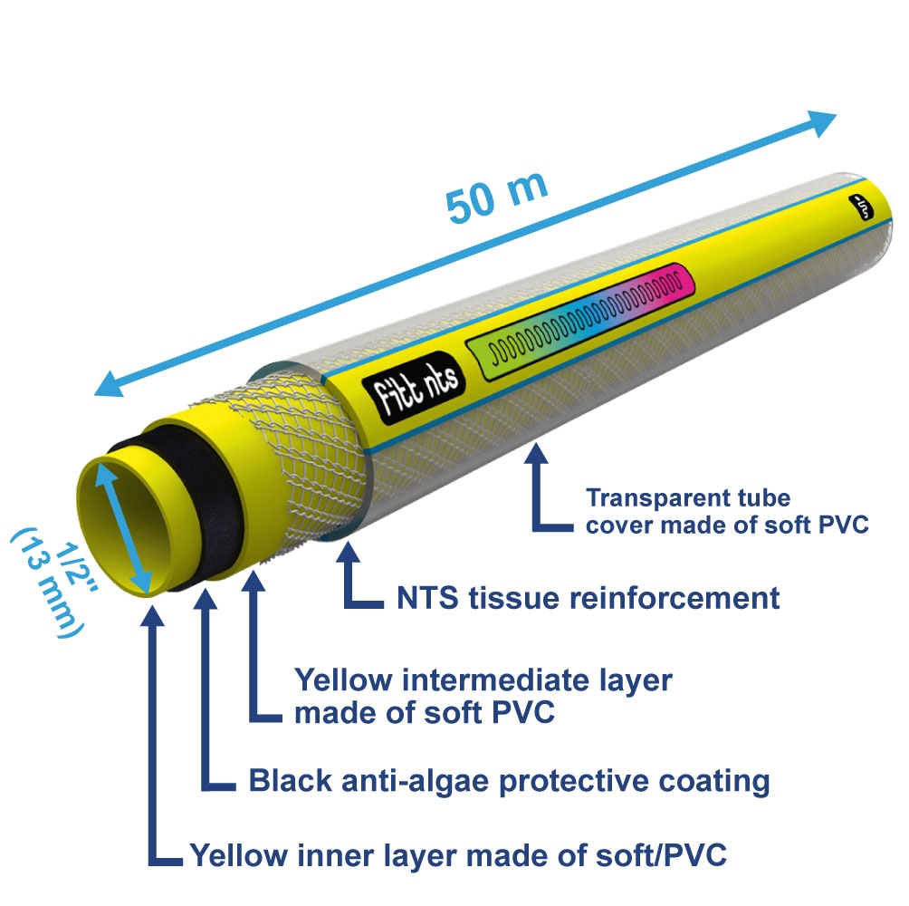 Fitt NTS Garden Hose is a robust 5-layer PVC hose with NTS technology to prevent twisting and kinking, featuring integrated UV and algae protection.Delivered with preassembled couplings (ready to use)Inner diameter: 1/2 (13 mm)Length: 50 mAlso available in: Features5-layer PVC constructionTwist- and kink-resistant thanks to NTS mesh reinforcementBlack inner layer to prevent algae formationOuter layer with UV protection and abrasion resistance (SKY TECH technology)Highly flexible, lightweight, and durable – ideal for intensive useSupplied with mounted couplings for immediate connectionApplicationsGarden irrigation, vegetable gardens, and nurseriesCleaning and agricultural useSuitable for long-term outdoor applicationsTechnical SpecificationsInner diameter13 mm (1/2)Length50 mWorking pressure10 barBurst pressure27barTemperature range-20 °C to +60 °CMaterialPVC (cover & core), polyester yarn reinforcementColorRed with yellow stripes Information on product safety (Manufacturer, Contact)FITT France S.A.S., 75 Boulevard de l’Europe, BP 60219 13746 Vitrolles Cedex, FRANCE, +33 04 42 75 04 93, , www.fitt.com