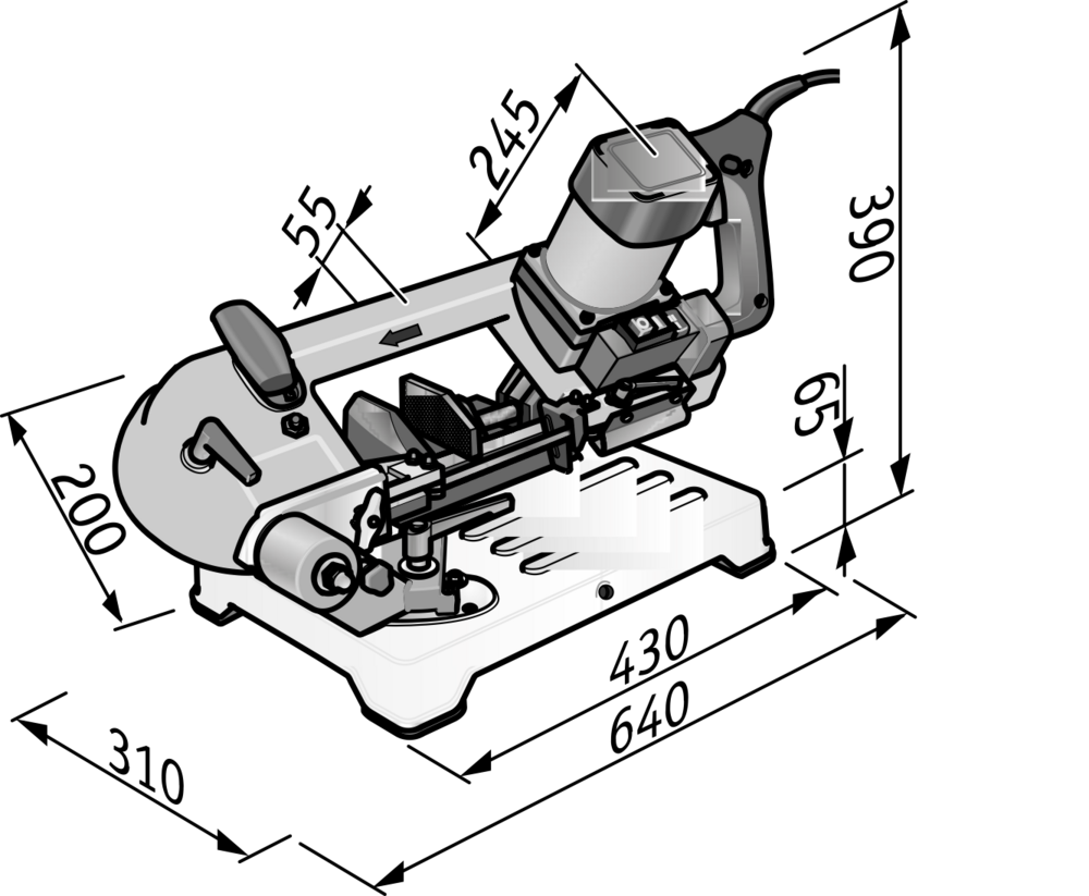 2 belt speeds: for sawing solid and hollow sectionsRecommended belt speeds: Step I, solid steel, stainless steel V2A, aluminium; Step II, steel, stainless steel V2A, aluminium tubesCutting without a stand: with 90° straight cut, round and square section, max. 90 mm, rectangular section max. 150 x 90 mmContinuous tool-free adjustment of the cutting angle from 0° – 45°With stand, easy release for freehand useWith bracket locking device: for mobile applications and easy transport3-point ball-bearing bandsaw blade guide for optimum blade controlSafety switch: prevents uncontrolled reactivation following power interruptionsWork without coolantEspecially in fire hazardous surroundings the SBG for spark free cutting of metalSpecificationsPower input: 850 wattPower output: 445 wattDimensions of saw band: 1335 x 13 x 0,65 mmBelt speed per minute: 60 / 80 m/minSize ( W x L x H) 640x310x390 mmMax. cutting range: round cross sectional cut at 45°/90° : 68 mm / 80 mmMax. cutting range: square cross sectional cut at 45°/90°: 60 mm / 80 mmMax. cutting range: rectangular cross sectional cut at 45°/90° : 68×55 mm / 100×80 mmCable length: 4,0 mWeight of saw arm: 7,9 kgWeight (complete unit): 18,0 kgStandard equipment1 parallel guide fence: 385.2471 bimetal saw blade: 1 piece Information on product safety (Manufacturer, Contact)FLEX-Elektrowerkzeuge GmbH, Bahnhofstraße 15, 71711 Steinheim, GERMANY, +49 7144 828 0, , www.flex-tools.com