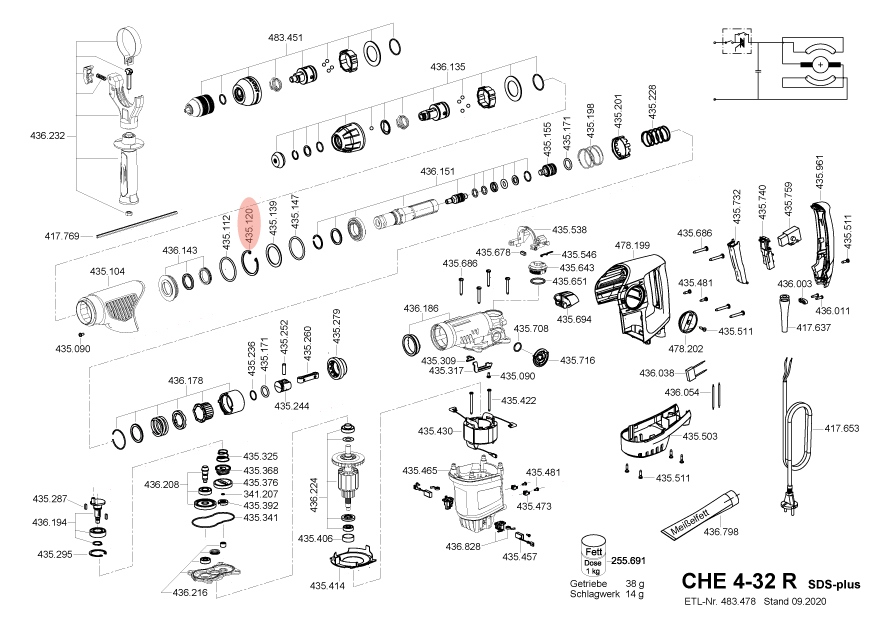 435.120 Retaining ring for rotary hammer drill CHE 4-32 Information on product safety (Manufacturer, Contact)FLEX-Elektrowerkzeuge GmbH, Bahnhofstraße 15, 71711 Steinheim, GERMANY, +49 7144 828 0, , www.flex-tools.com