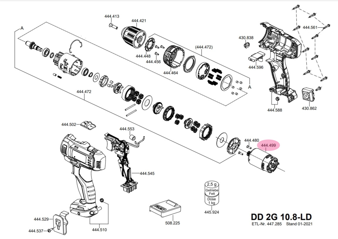 444.499 Motor for DD 2G 10.8 LD cordless drill driver Information on product safety (Manufacturer, Contact)FLEX-Elektrowerkzeuge GmbH, Bahnhofstraße 15, 71711 Steinheim, GERMANY, +49 7144 828 0, , www.flex-tools.com