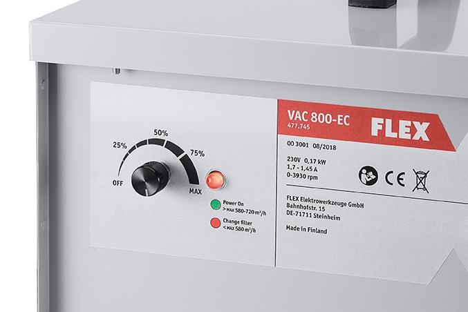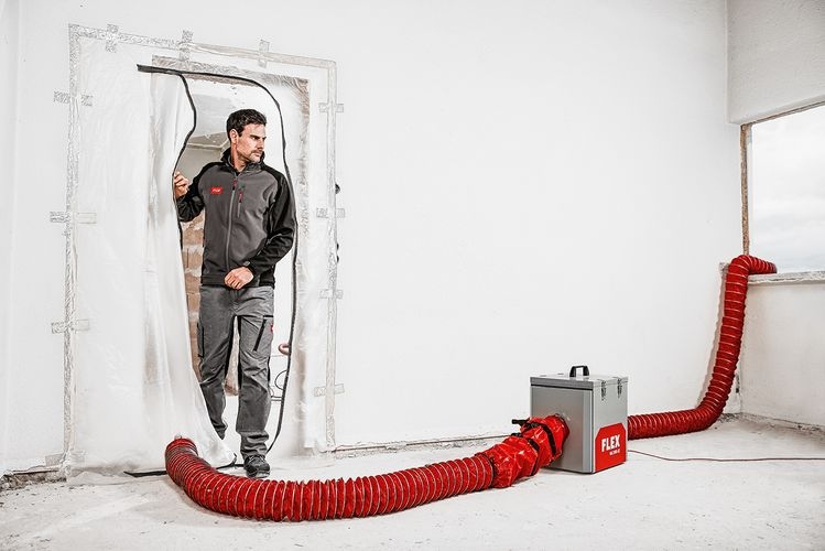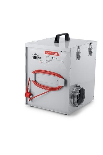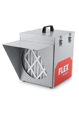For cleaning air during renovation and demolition work in very hazardous black areas. To protect users, fine respirable dust is filtered from the air by means of coarse, fine, M/H filters and activated carbon filtersDust is removed directly from wherever it is produced. A low pressure regime can be achieved by installing mobile plastic partitioning and air locks, thus preventing dust from spreading outside the work area.Volume flow monitoring and variable volume flow setting via rotary switch. The low pressure required can thus be freely adjusted and adapted to the working environmentBrushless motor with greater efficiency and a longer service lifeLow operating noise, with night functionCompact design, lightest tool of its class with 125 Ø mm air flow systemHigh air flowTechnical Specification Power input 170 wattNominal power consumption 1,7 – 1,45 ANo load speed 0-3930 rpmMax. volume flow 1000 m³/hMax. vacuum 1000 PaAir volume dust class H 580 – 720 m³/hFilter surface H13 > 7,26 m³ cm²Protection 10 VADust extraction connection Ø 125 mmSound pressure level 1 m, 58 dB(A)Size, complete unit ( W x L x H) 373 x 400 x 508 mmCable length 3 mWeight 11,2 kgEquipment 1 pre-filter mat G3 1 piece of 477.6991 coarse filter G 4477.7021 HEPA filter H13 477.7371 hose SH 125x5m C 477.6721 door airlock DL 2,3×1,3m PP 477.753 Information on product safety (Manufacturer, Contact)FLEX-Elektrowerkzeuge GmbH, Bahnhofstraße 15, 71711 Steinheim, GERMANY, +49 7144 828 0, , www.flex-tools.com