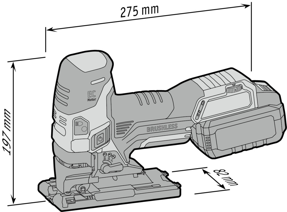 Cordless jigsaw 18.0 VElectronic management system (EMS) protects the machine, extends the service life, and increases efficiencyNew generation of brushless motors delivering high efficiency and performanceWith automatic start-up, overload protectionContinuously variable cutting speed setting via potentiometer wheel with automatic start-up in position AElectronic switch can be operated from both sidesOrbital stroke: 4 settings for higher cutting rateTool-free saw blade change with quick-clamping system and eject functionDouble roller jigsaw blade guide for precise cuts with accurate anglesRemovable chip screen, for tear-free cuts and for guiding the saw bladeSaw bench adjustment for bevel cuts of up to 45°, 0-lock. Can be set off backwards for sawing close to edgesStable base plate with removable plastic guide block for the protection of delicate surfacesVacuum flange Ø 27 mm, for a cleaner workplace and clear view of the cutFree view of the marking thanks to integrated blow functionPerfect ergonomics thanks to ideally located SoftGrip surfacesIntegrated LED lamp for optimum illumination of the work area.Low-vibration and comfortable sawingLED battery capacity displayFLEX battery system: suitable for all 18,0 V battery packsSpecificationsBattery voltage 18 VBattery capacity 2,5 / 5,0 AhOrbit rate, no load 0-3500 opmOrbit 26 mmPendulum stroke levels 4Speed settings 1-5 + APivoting range 0-45 °Max. cutting depth in wood 120 mmMax. material thickness in steel sheet 8 mmSize (W x L x H) 275 x 82 x 197 mmWeight without battery 2,1 kgEquipment1 guide block 490.2371 hexagon socket wrench, SW 4 102.2291 protection against flying swarf, closed 1 piece1 anti-splinter guard 490.2291 extraction adapter 490.2451 assortment of saw blades 490.0082 batteries 5.0 Ah AP 18.0/5.0 445.8941 charger CA 10.8/18.0 417.8821 carrying case L-BOXX® 136 414.0851 case insert 490.210 Information on product safety (Manufacturer, Contact)FLEX-Elektrowerkzeuge GmbH, Bahnhofstraße 15, 71711 Steinheim, GERMANY, +49 7144 828 0, , www.flex-tools.com