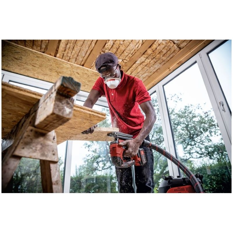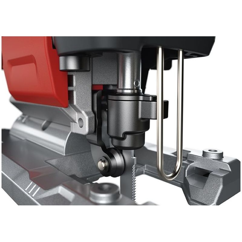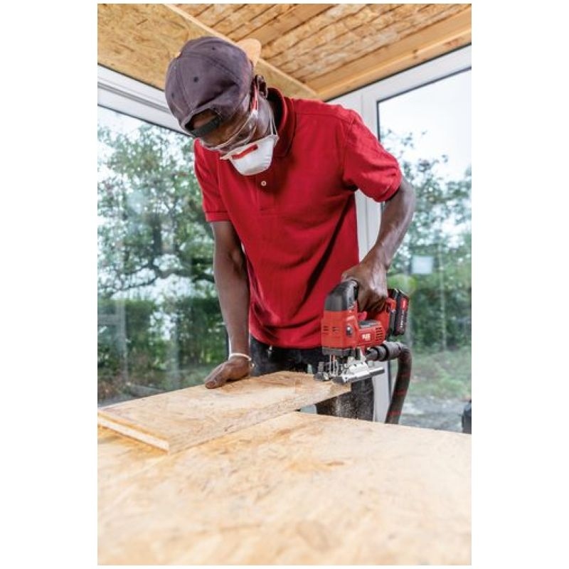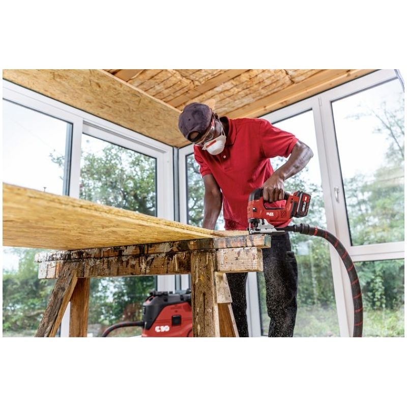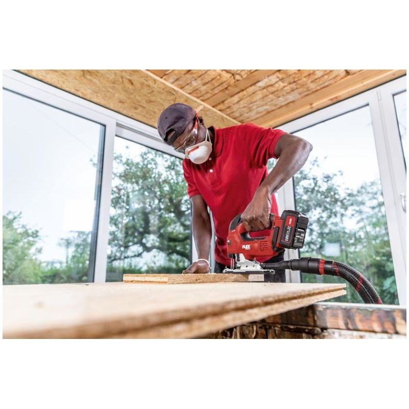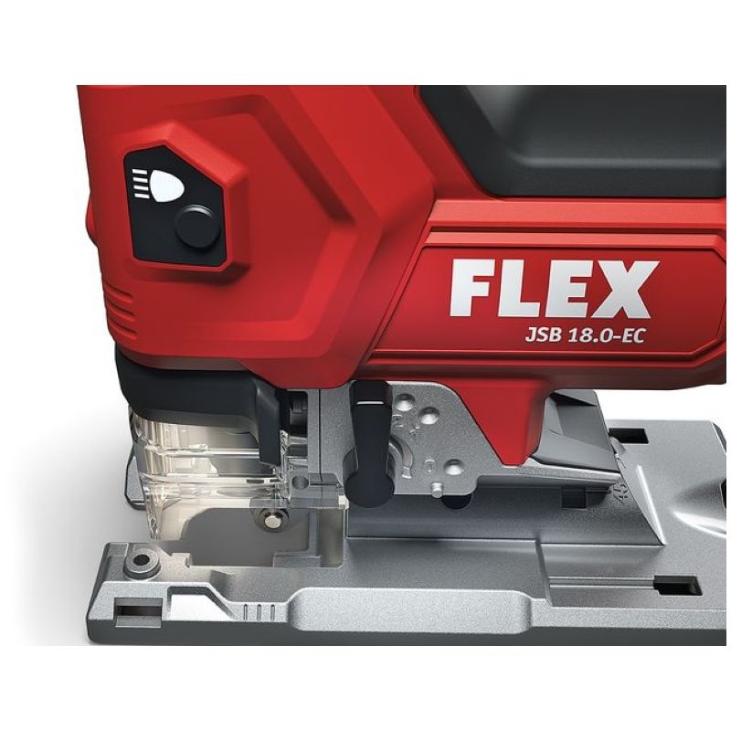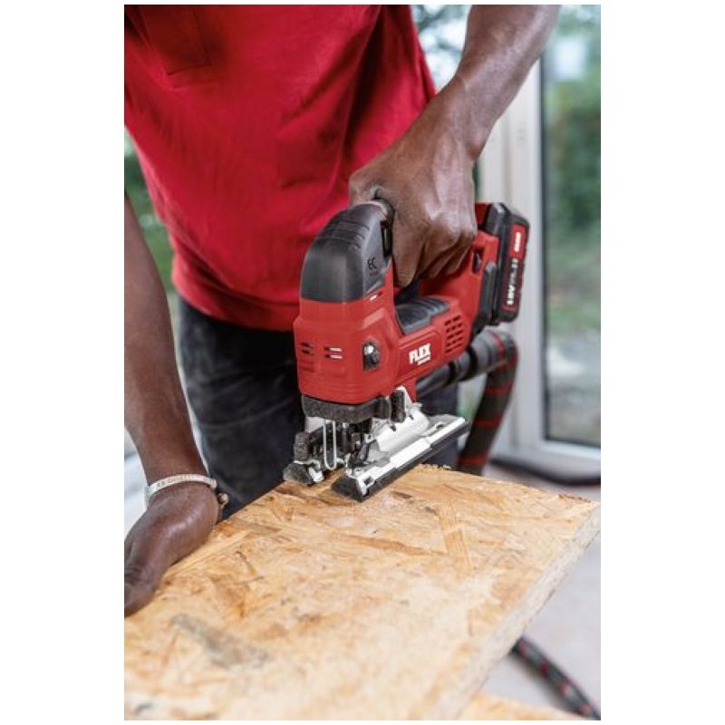 Cordless jigsaw with tool-free saw blade change, quick clamping system and ejection function Electronic management system (EMS) protects the machine, extends the service life, and increases efficiencyNew generation of brushless motors delivering high efficiency and performanceWith automatic start-up, overload protectionContinuously variable cutting speed setting via potentiometer wheel with automatic start-up in position AElectronic switch can be operated from both sidesOrbital stroke: 4 settings for higher cutting rateTool-free saw blade change with quick-clamping system and eject functionDouble roller jigsaw blade guide for precise cuts with accurate anglesRemovable chip screen, for tear-free cuts and for guiding the saw bladeSaw bench adjustment for bevel cuts of up to 45°, 0-lock. Can be set off backwards for sawing close to edgesStable base plate with removable plastic guide block for the protection of delicate surfacesVacuum flange Ø 27 mm, for a cleaner workplace and clear view of the cutFree view of the marking thanks to integrated blow functionPerfect ergonomics thanks to ideally located SoftGrip surfacesIntegrated LED lamp for optimum illumination of the work area.Low-vibration and comfortable sawingLED battery capacity displayFLEX battery system: suitable for all 18,0 V battery packs. Delivery does not include battery and chargerSpecificationsBattery voltage 18 VBattery capacity 2,5 / 5,0 AhOrbit rate, no load 0-3500 opmOrbit 26 mmPendulum stroke levels 4Speed settings 1-5 + APivoting range 0-45 °Max. cutting depth in wood 120 mmMax. material thickness in steel sheet 8 mmSize (W x L x H) 240 x 77 x 220 mmWeight without battery 2,1 kgEquipment1 guide block 490.2371 hexagon socket wrench, SW 4 102.2291 protection against flying swarf, closed 1 piece1 anti-splinter guard 490.2291 extraction adapter 490.245 Information on product safety (Manufacturer, Contact)FLEX-Elektrowerkzeuge GmbH, Bahnhofstraße 15, 71711 Steinheim, GERMANY, +49 7144 828 0, , www.flex-tools.com