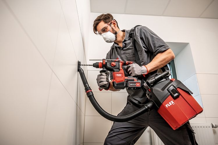 Cordless rotary hammer drill 18,0 VElectronic management system (EMS) protects the machine, extends the service life, and increases efficiencyBrushless motor with greater efficiency and a longer service lifePowerful motor with 2.6 joules of impact energy and a high rate of removalDrilling chuck can be removed without toolsQuick tool change: universal application, with SDS Plus drill chuck or 13 mm quick-release chuckAccelerator switch with lock-on functionElectronic quick-acting brakeRotation stop for chisellingFunction switch with four functions: drilling, hammer drilling, chiselling, chisel adjustmentRobust gearbox housing made of die-cast aluminiumDecoupled, ergonomic handle with rubberised grip surface. Vibrations are reduced by a sprung damper and additional vibration damping between the housing and handleNon-rotating additional handle with depth stopIntegrated LED lamp with persistence functionIdeal for daily use for drilling and chiselling in concrete, brickwork, timber and metalLED battery capacity displayFLEX battery system: suitable for all 18,0 V battery packs. Delivery does not include battery and chargerSpecificationsBattery voltage 18 VBattery capacity 2,5 / 5,0 AhNo load speed 0-980 rpmBlows per minute 0-4350 bpmSingle impact energy (EPTA) 2,6 JMax. drill hole Ø in steel 13 mmMax. drill hole Ø in concrete 26 mmMax. drill hole Ø in wood 30 mmTool fixture SDS-plusChuck Ø 1,5 – 13 mmWeight without battery 3,18 kgEquipment1 chuck BF SDS-plus CHE2 468.8351 handle 436.3641 depth stop 417.769 Information on product safety (Manufacturer, Contact)FLEX-Elektrowerkzeuge GmbH, Bahnhofstraße 15, 71711 Steinheim, GERMANY, +49 7144 828 0, , www.flex-tools.com