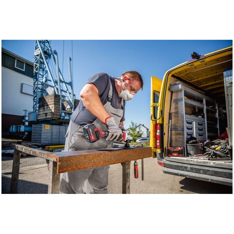 Cordless angle grinder with variable speed and brake 18.0 V, 125 mmElectronic management system (EMS) protects the machine, extends the service life, and increases efficiencyBrushless motor with greater efficiency and a longer service lifeMicroprocessor control with soft start, restart protection after power failure, temperature monitoring, overload protection, CDC-electronic feedback controlWith electronic brake, stops the tool in 3 secondsAnti-Kickback – this shuts down the motor on the disc being blockedPerfect dust protection thanks to removable protective metal grilleExtremely streamlined handle section with soft-grip inlays for perfect handlingMore ergonomic handling due to inclined side handleTool-free adjustment of safety guardSpindle lockFLEX battery system: suitable for all 18,0 V battery packs. Delivery does not include battery and chargerSpecificationsBattery voltage 18 VBattery capacity 2,5 / 5,0 AhMax. disc diameter 125 mmNo load speed 3500 / 4500 / 6500 / 9000 rpmTool fixture M 14Size (W x L x H) 330 x 75 x 120 mmWeight without battery 1,85 kgEquipment1 guard grinding 125 Ø 436.8601 handle 450.7741 pin wrench 100.1101 clamping flange 335.2821 clamping nut 100.080 Information on product safety (Manufacturer, Contact)FLEX-Elektrowerkzeuge GmbH, Bahnhofstraße 15, 71711 Steinheim, GERMANY, +49 7144 828 0, , www.flex-tools.com