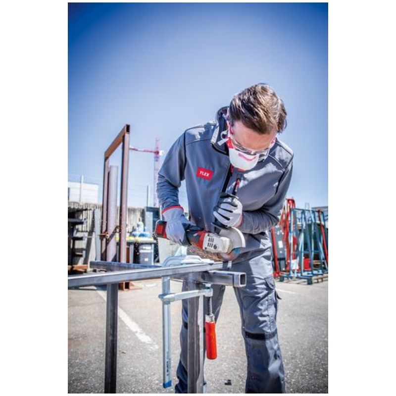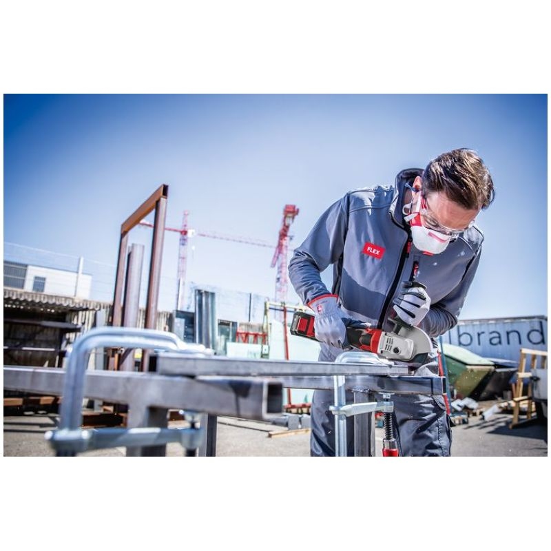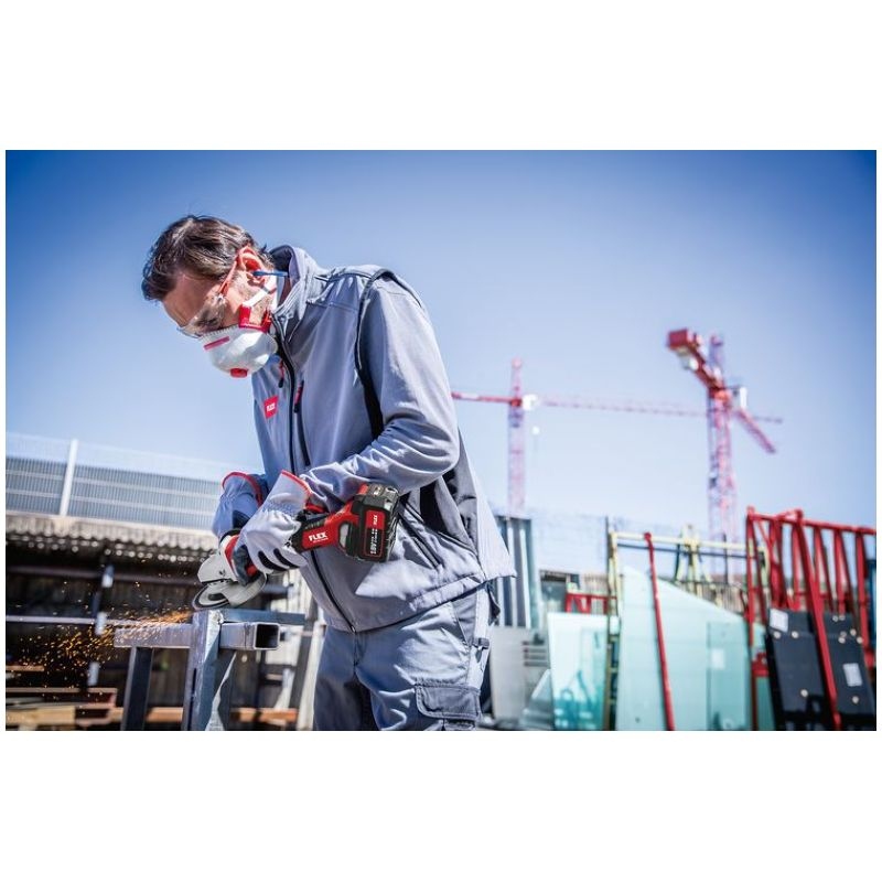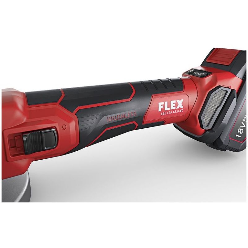Cordless angle grinder with variable speed and brake 18.0 V, 125 mm with charger, 2 batteries and L-BOXX® 136Electronic management system (EMS) protects the machine, extends the service life, and increases efficiencyBrushless motor with greater efficiency and a longer service lifeMicroprocessor control with soft start, restart protection after power failure, temperature monitoring, overload protection, CDC-electronic feedback controlWith electronic brake, stops the tool in 3 secondsAnti-Kickback – this shuts down the motor on the disc being blockedPerfect dust protection thanks to removable protective metal grilleExtremely streamlined handle section with soft-grip inlays for perfect handlingMore ergonomic handling due to inclined side handleTool-free adjustment of safety guardSpindle lockFLEX battery system: suitable for all 18,0 V battery packs. Delivery does not include battery and chargerSpecificationsBattery voltage 18 VBattery capacity 2,5 / 5,0 AhMax. disc diameter 125 mmNo load speed 3500 / 4500 / 6500 / 9000 rpmTool fixture M 14Size (W x L x H) 330 x 75 x 120 mmWeight without battery 1,85 kgIncluded in delivery1 guard grinding 125 Ø 436.8601 handle 450.7741 pin wrench 100.1101 clamping flange 335.2821 clamping nut 100.0802 batteries 5.0 Ah AP 18.0/5.0 445.8941 charger CA 10.8/18.0 417.8821 carrying case L-BOXX® 136 414.0851 case insert 444.405 Information on product safety (Manufacturer, Contact)FLEX-Elektrowerkzeuge GmbH, Bahnhofstraße 15, 71711 Steinheim, GERMANY, +49 7144 828 0, , www.flex-tools.com