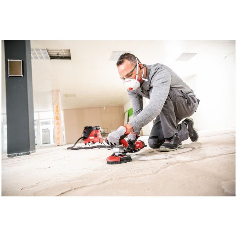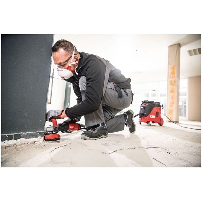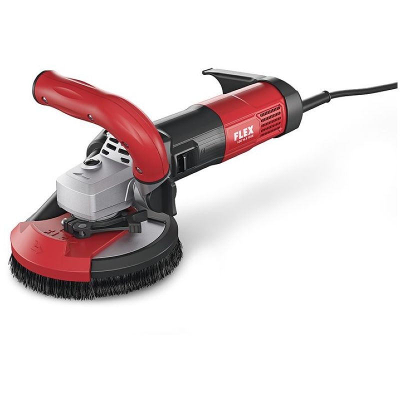 Refurbishment grinder with variable speed for dust-free edge grinding, 125 mm. Microprocessor control with soft start, restart protection after power failure, temperature monitoring, overload protection, CDC-electronic feedback controlReliable 1600 watt high-performance motor with sufficient power reservesDust extraction: prevents dust nuisance, reduces disc wear, keeps the concrete pores open for the new coatingAnti-Kickback – this shuts down the motor on the disc being blockedGuard with pivoting segment to allow grinding right up to the wall. Height-adjustable to the disc height and for optimum dust extractionWith steplessly adjustable, vibration-proof, ergonomic bail handle, for optimum handling and machine controlFor fast hose connection. FLEX clip connection for Ø 32 mm snap connection included in the standard equipmentRecessed spindle lock, to avoid unintentional activationVariable speed for dust minimization in case of tool protrusion, as well as better control of finer work with less pressure, e.g. on edges, and during the final smoothing of surfacesIdeally suited for processing walls, ceilings and floors. Efficient and economic working thanks to optimum coordination between machine and sanding discTurbo-Jet grinding disc with optimum removal rate. The large number of diamond segments provides a considerably quieter operating performance and a more attractive sanding pattern. Ideal for surface grinding on mineral substrates.SpecificationsDisc Ø 125 mmNo load speed 4500-7800 rpmPower input 1600 wattPower output 950 wattTool fixture M 14Cable length 4,0 mWeight 3,1 kgEquipment 1 Turbo-Jet grinding disc II 453.7731 dust extraction hood with brush ring 498.4751 bail handle 1 piece3 cable clips 252.188 (3x)1 hexagon socket wrench, SW 4 102.2291 pin wrench 392.5371 carrying case L-BOXX® 238 414.0931 case insert 414.131 Information on product safety (Manufacturer, Contact)FLEX-Elektrowerkzeuge GmbH, Bahnhofstraße 15, 71711 Steinheim, GERMANY, +49 7144 828 0, , www.flex-tools.com