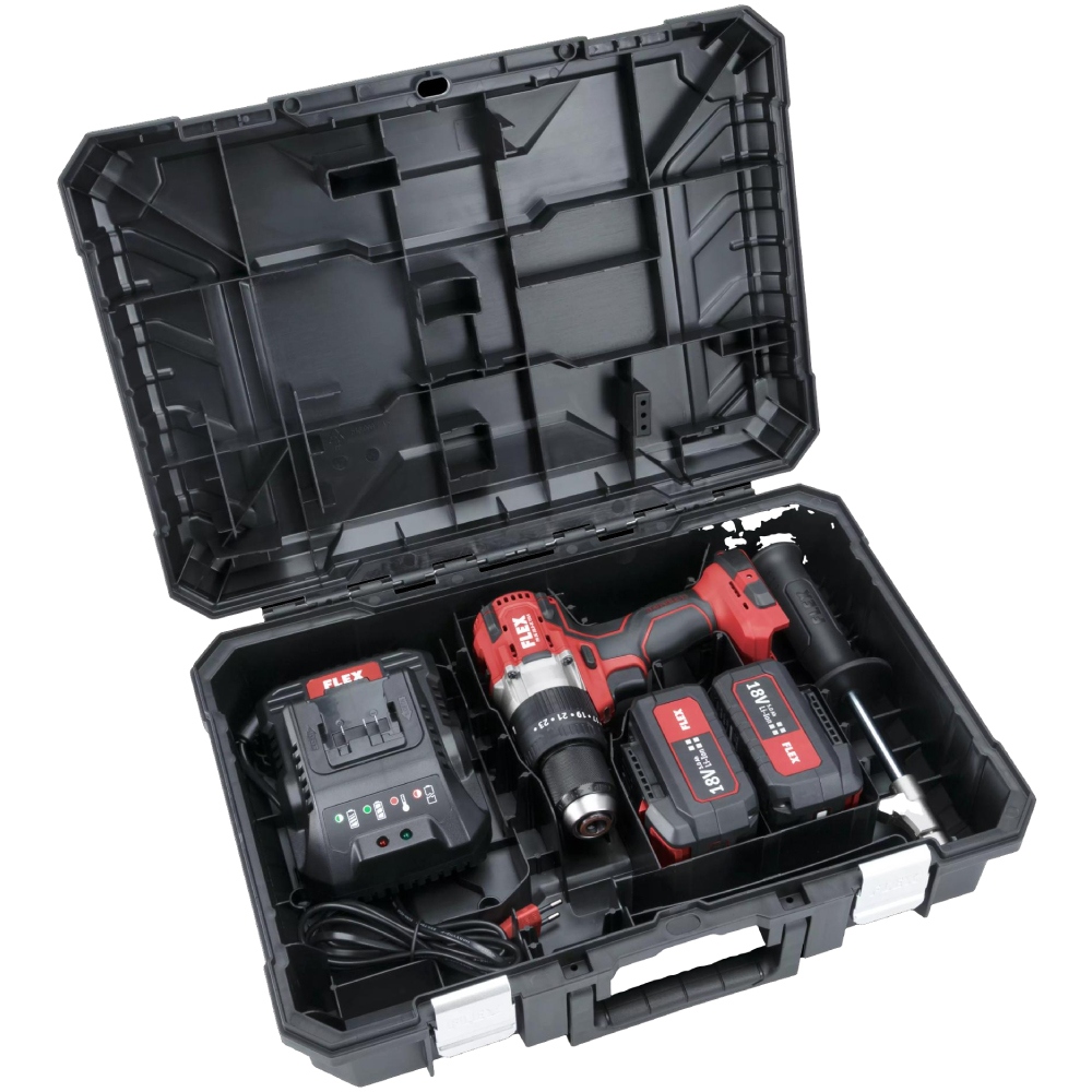 Flex 516.171 2-speed cordless percussion drill 18,0 V + 2 Batteries + Charger + Carrying caseThe set includes1x Charger CA 18.0-LD (483745)1x Belt clip DD/PD/ID 18.0 (430714)1x Bit holder DD/PD/ID 18.0 (430862)1x Carrying caseHandle2x Li-Ion rechargeable battery pack AP 18 V, 5.0 Ah (532733)PD 2G 18.0-EC FS55BC/5.0 2-speed cordless percussion drill 18,0 VElectronic management system (EMS) protects the machine, extends the service life, and increases efficiencyBrushless motor with greater efficiency and a longer service lifeAccelerator trigger with lock-off switchElectronic quick-acting brakeRobust gearbox housing made of die-cast aluminiumMetal quick-clamp chuck with thrust ring and auto lock functionRight/left rotation with safety catchErgonomically designed, non-slip, soft grip handleIntegrated LED lamp with persistence functionLED battery capacity displayIncluding attachable auxiliary handle, belt clip and bit storageFLEX battery system: suitable for all FLEX 18 V battery packsTechnical specificationsBattery voltage: 18.0 VMax. torque, hard: 75 NmMax. torque, soft: 50 NmTorque adjustment: 24 StepsNo-load speed, 1st gear: 0 – 600 rpmNo-load speed, 2nd gear: 0 – 2300 rpmChuck clamping width: 1,5 – 13 mmMax. drilling diameter in wood: 60 mmMax. drilling diameter in stone: 16 mmMax. drilling diameter in steel: 13 mmNumber of supplied batteries: 2 Cont.With charger: YesDimensions WxLxH: 212 x 75 x 201 mmWeight without battery pack: 1.6 kg