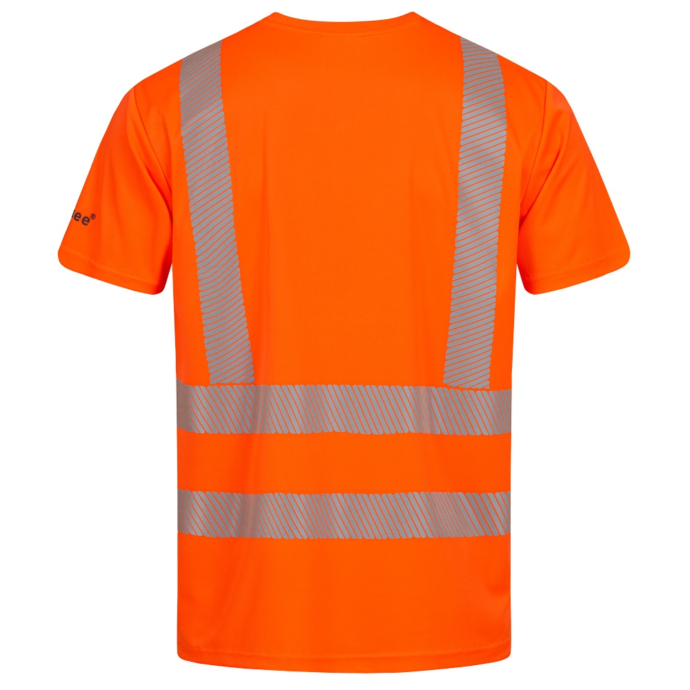Standards: EN 20471 class 2, EN 13758-2, EN ISO 13688Fabric: 100% recycled polyesterWeight: ca. 150 g/m²Colour: high visibility orangeSizes: S-XXXXLComfortably protected and with a good conscience!Eco friendly recycled polyester fabricThe fabric is very light, outstandingly comfortable, breathable and moisture regulatingThe high quality ironed reflective stripes reduce the weight of the t-shirt, reduce the need for additional seams and improve the comfortImportant UV protection for the summer months with an UV protection factor of UPF 40+V-neck