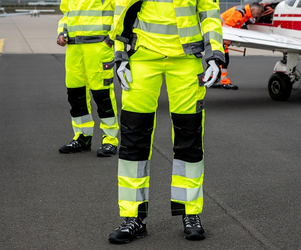 High visibility trousers | LeiKaTex BRIGHT LINE seriesStandard: EN ISO 20471 class 2, EN 13688, OEKO-TEX® STANDARD 100Material: 80% polyester, 20% cotton, approx. 280 g/m²Reinforcement: 500D CORDURA®Color: fluorescent yellow/greySizes: 24-29, 44-64SpecificationsThermofixed reflective stripesStitched reflective stripes inside lower legGray applicationsWith elastic knit inserts on both sides for more mobility and higher wearing comfortDurable triple seams on legs and crotchIn combination with item 23209407 (LeiKaTex ErgoPad) certified according to DIN EN 14404:2004+A1:2010, PPE type 2, performance level 1Reinforcement on the inside of the ankle made of black hard-wearing CORDURA®.Raised back partPockets2 back pockets with grey flap and Velcro fastener2 side pockets on the left with zippered security pocket1 ruler pocket on the right incl. tool and pen pocket1 thigh pocket left with pen pocket outside, grey flap and velcro fastener and cell phone pocket inside2 hammer loopsknee pad pocket made of black robust CORDURA® with velcro fastenerLooking for a ? Information on product safety (Manufacturer, Contact)Richard Leipold GmbH, Industriestraße 1 1, 34260 Kaufungen, GERMANY, +49 5605 9481-0, , www.richard-leipold.de