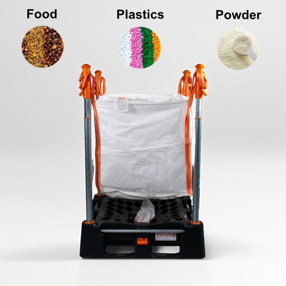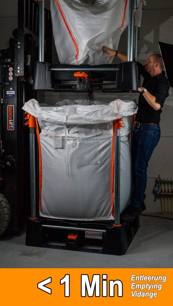 Indus Flow is the ideal solution for companies looking to simplify and automate the handling of 1m³ Big Bags, with a focus on Big Bag emptying. This innovative system provides a comprehensive all-in-one solution: from filling to transportation and finally to complete and safe emptying, everything can be done within a single system.ApplicationsAgricultural industry: Ideal for seeds, grains, fertilizers, and similar bulk materials.Food industry: Efficient handling of coffee beans, flour, sugar, spices, and other food products, also available in food-grade stainless steel options.Chemical and pharmaceutical industry: Perfect for powders, granules, and pills.Production and logistics: For companies that need to efficiently and safely fill, transport, empty, and store Big Bags.BenefitsAll-in-one solution: Filling, transporting, and emptying in one system – efficient and reliable.Improved design: Integrated spring head with 200 kg spring force – four times stronger than previous models – making automatic filling and emptying significantly easier.Optimal storage: Allows stacking of Big Bags in up to two levels – for higher stacking up to 7 meters, the is recommended.Flexibility: Suitable for a variety of materials such as seeds, coffee beans, powders, granules, pills, and more.Safety and stability: Robust galvanized steel construction for maximum load capacity and durability.Technical Details Pole Material Galvanized Steel (60 x 2.5 mm) Pole Height 1180 mm Spring Force 200 kg (4x stronger than the Neva spring head) Total Height (normal / compressed) 1560 mm / 1375 mm Weight (Total / Pallet / Pole) 60 kg / 30 kg / 7.5 kg Maximum Load Capacity per System 1500 kg Stacking Capacity Maximum 2 levels Base Dimensions (Pallet) 1200 x 1200 mm Ideal Big Bag Bottom Dimensions 950×950 mm – 1000×1000 mm Ideal Big Bag Height / Loop Length 1050 mm / 400 mm 1100 mm / 350 mm 1150 mm / 300 mm 1200 mm / 250 mm 1250 mm / 200 mmWhy Indus Flow?The Indus Flow system is an evolution of the proven Big Bag handling system, combining efficient filling with optimized emptying. The new, integrated spring head with 200 kg of force significantly simplifies Big Bag handling, saving time and costs. It is suitable for a wide range of materials, from seeds and coffee beans to granules and pills, while providing maximum safety and stability.The system can be stacked in up to two levels, for higher storage heights up to 7 meters, the Indus Neva system is recommended.Experience the next generation of Big Bag handling – efficient, safe, and automated. Need a customized quote for your Big Bags? → and send it to Information on product safety (Manufacturer, Contact)INDUS INTEGRATED BULK LOGISTICS B.V., Botter 8, 2411 NM Bodegraven, NETHERLANDS, +31 172 72 71 69, , www.indus-bulklogistics.com