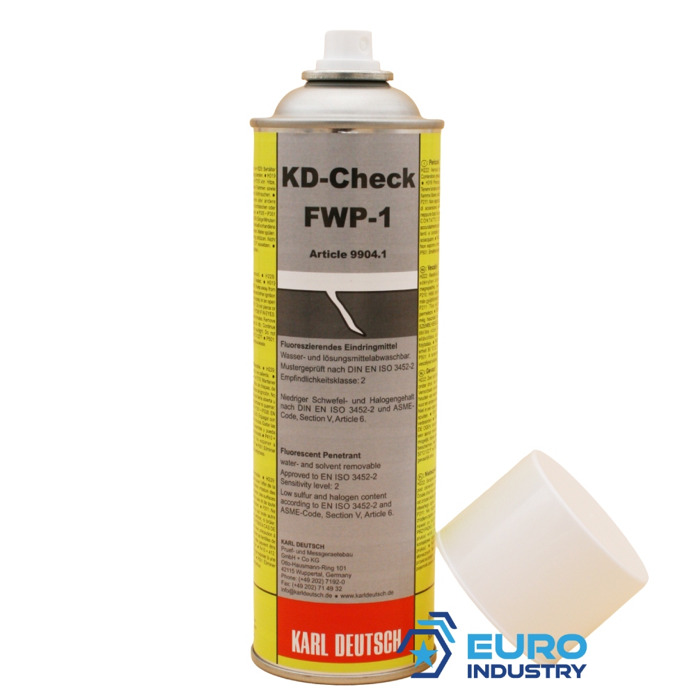 Karl Deutsch KD-Check FWP-1 Penetrant is a highly sensitive testing aerosol spray for the finest cracks in critical components (sensitivity class 2).ApplicationsMainly used with serial testing of critical components, for example in the aerospace and automotive industryWhen used in stationary systems, a large number of components can be checked reproducibly for finest cracks within a short period of timeIn combination with dry developers, which are applied by spraying or electrostatically, the sensitivity during testing is increased even furtherCharacteristicsOil-based Fluorescent PenetrantWater-washable and solvent-removableSuitable for ferrous and nonferrous metals (Check suitability for plastics before application)Reduced test agent consumption due to low viscosity and optimum dripping propertiesExcellent wetting properties, especially on smooth surfacesVery good wash-off properties on rough surfacesLow background fluorescenceHigh test reliability due to strong contrast formationLow sulfur and halogen content according to DIN EN ISO 3452-2 and ASME Code, Section V, Article 6Can be used in a temperature range from +10 °C to +50 °CSample tested according to DIN EN ISO 3452-2Size: 500mlPackaging type: aerosol sprayApplication notesClean parts thoroughly. Ensure parts are free from grease, oil and other pollutants. Defects must be open to the surface. Dry the parts after cleaning. Recommended cleaner: KD-Check PR-1 (Ref. ) or PR-2 (Art. No. 9907).Apply Penetrant KD-Check FWP-1 to the clean and dry surface and allow to dwell for 5 – 10 minutes.Remove the excess Penetrant KD-Check FWP-1 from the surface under Black-Light-control, eithera) by rinsing it off with water orb) by wiping it off with a clean, lint-free cloth, barely dampened with cleaner KD-Check PR-1.Dry the surface.Apply a wafer-thin film of Developer KD-Check SD-1 (Ref. ) under Black-Light-control to thedry surface from a distance of about 20 cm. Too much developer may hide fine defects! Soon defects become visible as yellow-green fluorescent lines and development is complete after 5 – 10 minutes. Alternative KD-Ckeck DD-1 dry developer (Art.-No. 9908) may be used.Technical Specifications Karl Deutsch Manufacturer Nr. 9904.1 Sensitivity (DIN EN ISO 3452-2) 2 (medium sensitivity) Density 20°C (DIN 51 757) 0,9 g/cm³ Flash point (DIN 51 755) 93 °C Viscosity, 20°C (EN ISO 3104) 10,6 mm²/s Corrosive ingredients (DIN EN ISO 3452) Halogene (F + Cl): < 20 ppm Sulfur: < 10 ppm Min. Storage Time 3 years (at room temperature)AttentionDangerous substances and/or dangerous goods, see safety data sheet.Not available in all countries.Express delivery not possible.Hazard Warnings (CLP)Signal word: DangerHazard Statements (H-phrases)H304: May be fatal if swallowed and enters airways.H319: Causes serious eye irritation.Safety Statements (P-phrases)Prevention:P280: Wear protective gloves/protective clothing/eye protection/face protection/hearing protection/...Response:P301+P310: IF SWALLOWED: Immediately call a POISON CENTER/doctor/...P305+P351+P338: IF IN EYES: Rinse cautiously with water for several minutes. Remove contact lenses if present and easy to do. Continue rinsing.P331: Do NOT induce vomiting.P337+P313: If eye irritation persists: Get medical advice/attention.Disposal:P501: Dispose of contents/container to hazardous waste.Other HazardsNo data available×Hazardous materials. The forwarding charges may be raised, if shipping to: DE, AT, NL, GB, CH, CZ, IT, ES, FI, NO, BE, IE, RO, PL, FR, PT, LU, DK, LI, GR, SE, SK, BG, SI, CA, LT, EE, LV, HR, SA, Information on product safety (Manufacturer, Contact)KARL DEUTSCH Prüf- und Messgerätebau GmbH + Co KG, Otto-Hausmann-Ring 101, 42115 Wuppertal, GERMANY, +49 202 7192 0, , www.karldeutsch.de