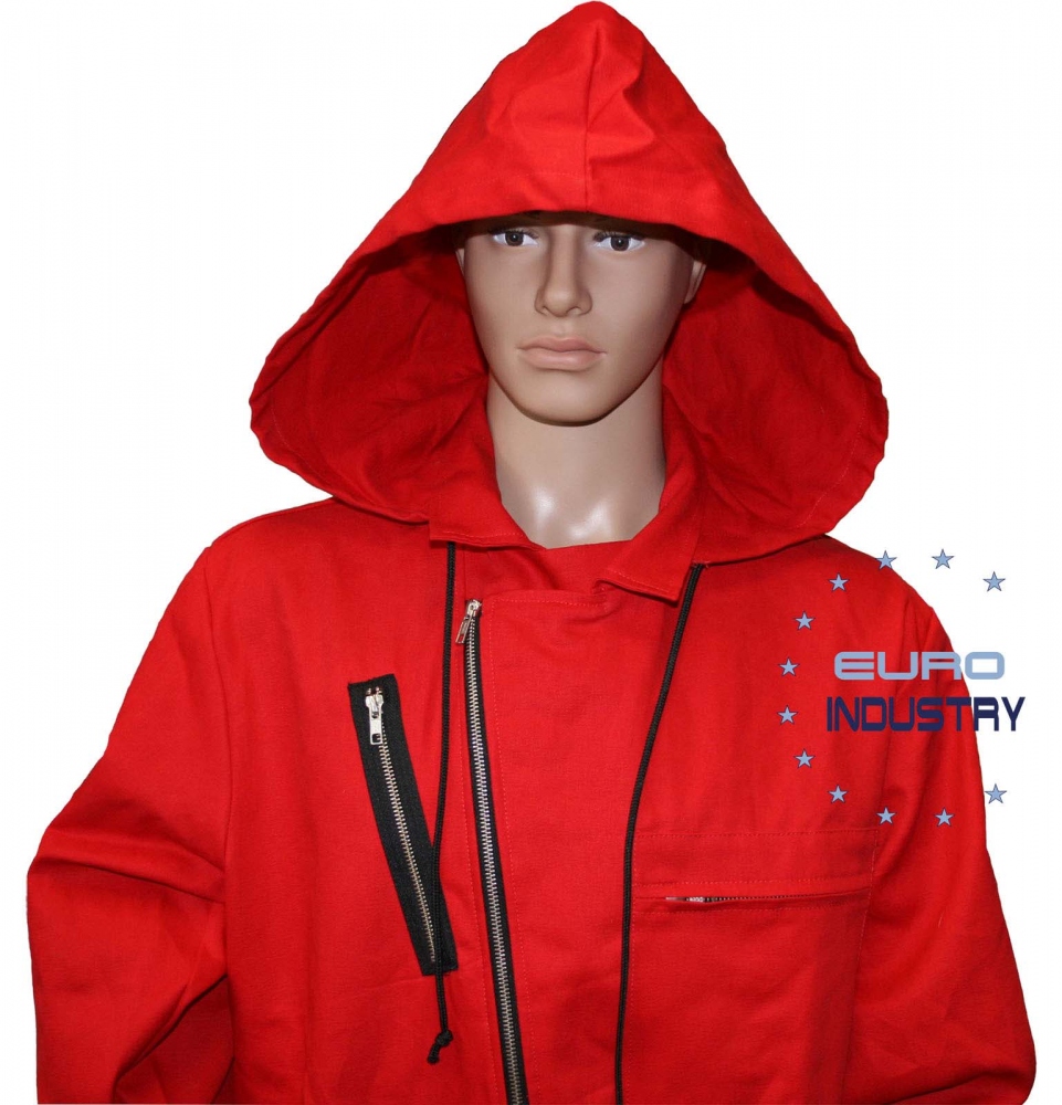 The casa de papel overall has finally arrived and is available now on euro-industry.comThe one and only 100% cotton Casa de Papel overall available!The cotton is not only abrasion resistant but also strong against mechanical stress.The material also offers good thermoregulation and is skin friendly.With 3 pockets and reinforcements in more sensitive areas, this overall is not only functional, but also durable and resistant.Identical replica of the overall used in the TV Serie La Casa de Papel Material: 100% cotton, approx. 290 g/m²Kids Sizes: 104-176 (in cm)Color: red Specifications2-way front zip1 breast pocket on the right side with zip2 reinforced side pockets2 side openings1 hood with laceDelivery: 1 Original Casa de Papel Overall without mask Information on product safety (Manufacturer, Contact)E.I.S. Euro Industry Supply GmbH & Co. KG, Heilbronner Str. 150, 70191 Stuttgart, GERMANY, +49 (0) 711 460 59 21 40, , www.euro-industry.com