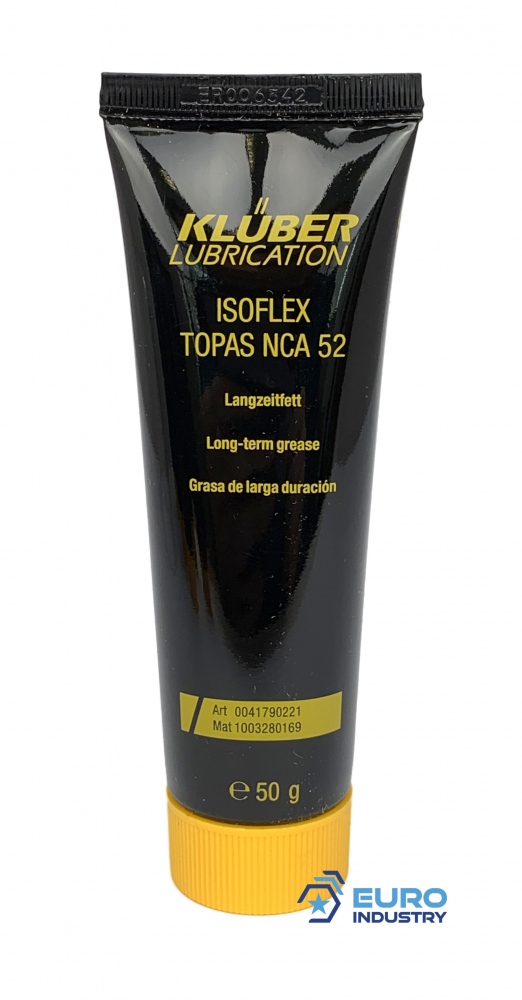 Synthetic long-term greaseISOFLEX TOPAS NCA 52 is a synthetic long-term grease with good low-temperature properties. It has a good load-carrying capacity and ensures smooth running even at high speeds and accelerations.The thickener made of special calcium soap ensures good adhesion to the component and good resistance to media.The additives contained in ISOFLEX TOPAS NCA 52 increase wear protection.Content: 40g tubeAvailable in 40g tube, 400g cartridge, 1kg can, 25kg bucketBenefits for your application:Reduced maintenance due to long-term or lifetime lubricationReliable operation and many years of practical experienceWide application range even with high loadsLow starting and running torques particularly at low temperatures ensure high efficiency and energy savingsLonger component life due to good wear protectionApplication:ISOFLEX TOPAS NCA 52 is used for high-speed rolling and plain bearings as well as for small gears subject to high loads. Due to the good compatibility with plastics the grease is suitable for plastic-plastic or metal-plastic material combinations. The low starting torque and the good wear protection make it an ideal grease for the long-term lubrication of linear motion guides and ball screws, e.g. in handling and automation technology.ISOFLEX TOPAS NCA 52 can also be used for many automobile applications, e.g. for the lifetime lubrication of seat rails. It is suitable for components which have to be lubricated prior to dip painting and the drying process at peak temperatures of 180 °C as the lubricant remains at the friction point and provides reliable lubrication even after short thermal treatment.Product data:Article number4179Chemical composition, type of oilsynthetic hydrocarbon oilChemical composition, thickenerspecial calcium soapLower service temperature-50 °C / -58 °FUpper service temperature130 °C / 266 °FColour spacebeigeDensity at 20 °Capprox. 0,89 g/cm³Worked penetration, DIN ISO 2137, 25 °C, lower limit value265 x 0,1 mmWorked penetration, DIN ISO 2137, 25 °C, upper limit value295 x 0,1 mmKinematic viscosity of the base oil, DIN 51562 pt. 01/ASTM D-445/ASTM D 7042, 40 °Capprox. 31 mm²/sKinematic viscosity of the base oil, DIN 51562 pt. 01/ASTM D-445/ASTM D 7042, 100 °Capprox. 5,9 mm²/sShear viscosity at 25 °C, shear rate 300 s-1, equipment: rotational viscometer, lower limit value2 800 mPasShear viscosity at 25°C, shear rate 300 s-1, equipment:rotational viscometer, upper limit value5 200 mPasCorrosion inhibiting properties of lubricating greases, DIN 51802, (SKF-EMCOR), test duration: 1 week, distilled water<= 1 corrosion degreeCopper corrosion, DIN 51811, (lubricating grease), 24h/120 °C1 - 120 corrosion degreeFlow pressure of lubricating greases, DIN 51805, test temperature: -40 °C<= 1 400 mbarSpeed factor (n x dm)approx. 1 000 000 mm/minDrop point, DIN ISO 2176, IP 396>= 220 °CMinimum shelf life from the date of manufacture – in a dry, frost-free place and in the unopened original container, approx.36 months Information on product safety (Manufacturer, Contact)KLÜBER LUBRICATION MÜNCHEN GMBH & CO. KG, Geisenhausenerstraße 7, 81379 München, GERMANY, +49 89 7876 0, , www.klueber.com