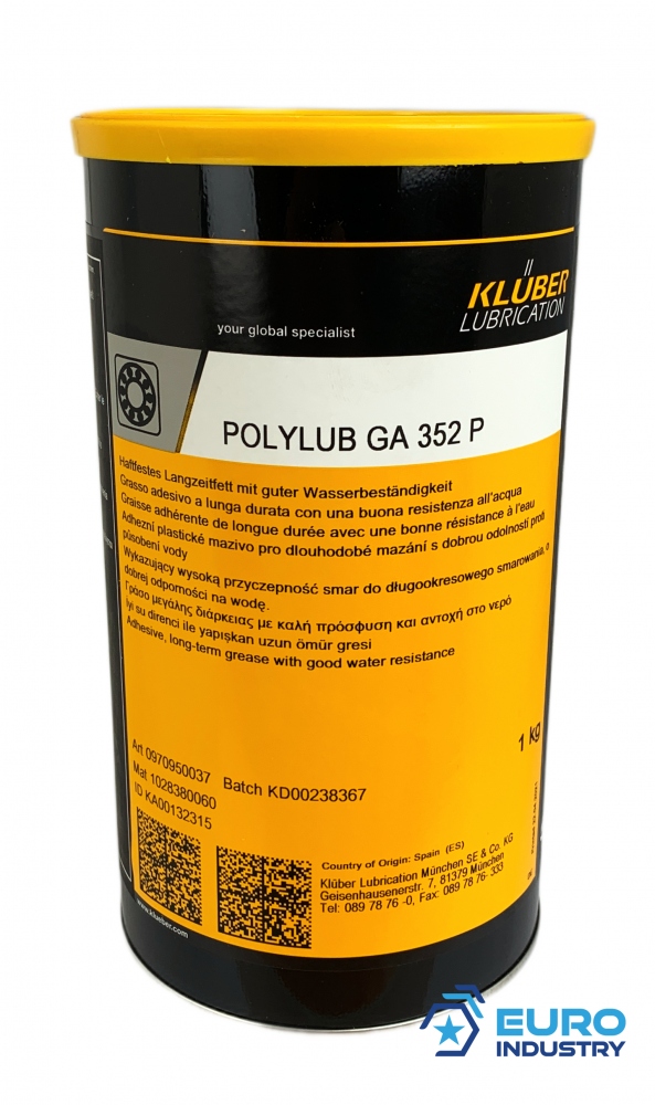 Adhesive long-term grease with good water resistance.POLYLUB GA 352 P is an aluminium complex thickened grease incorporating a semi synthetic base oil.Content: 1kg canAvailable in 400g cartridge, 1kg can, 25kg bucketBenefits for your applicationGood water resistanceGood adhesionApplicationPOLYLUB GA 352 P is used for the lubrication of rolling and plain bearings, racks, cylinder guides, pneumatic cylinders, load rollers and slideways.POLYLUB GA 352 P is suitable for machines and installations in the food-processing and related industries where contact with the food product is excluded.Application notesPOLYLUB GA 352 P can be applied by means of brush, spatula or grease gun.Product data Article number 097095 Chemical composition, type of oil synthetic hydrocarbon oil Chemical composition, type of oil mineral oil Chemical composition, thickener aluminium complex soap Lower service temperature -35 °C / -31 °F Service temperature, upper limiting value for continuous lubrication 120 °C Appearance transparent Color space yellow Texture fibrous Texture homogeneous Worked penetration, DIN ISO 2137, 25 °C, lower limit value 280 x 0.1 mm Worked penetration, DIN ISO 2137, 25 °C, upper limit value 310 x 0.1 mm Shear viscosity at 25°C, shear rate 300 s-1, equipment:rotational viscometer, upper limit value 5 500 mPas Shear viscosity at 25 °C, shear rate 300 s-1, equipment: rotational viscometer, lower limit value 3 000 mPas Corrosion inhibiting properties of lubricating greases, DIN 51802, (SKF-EMCOR), test duration: 1 week, distilled water <= 1 corrosion degree Drop point, DIN ISO 2176, IP 396 >= 220 °C Minimum shelf life from the date of manufacture – in a dry, frost-free place and in the unopened original container, approx. 24 months Information on product safety (Manufacturer, Contact)KLÜBER LUBRICATION MÜNCHEN GMBH & CO. KG, Geisenhausenerstraße 7, 81379 München, GERMANY, +49 89 7876 0, , www.klueber.com