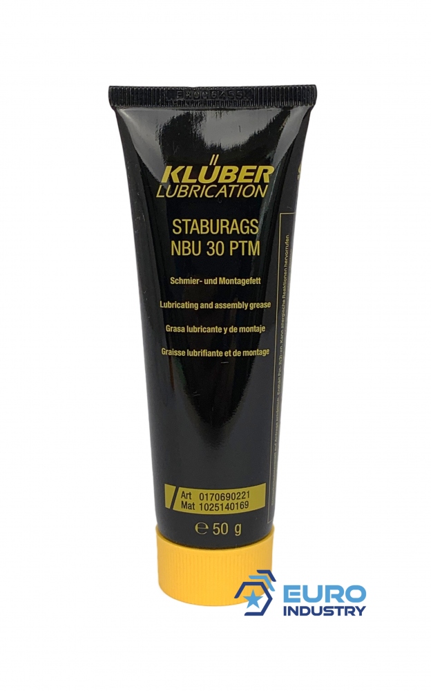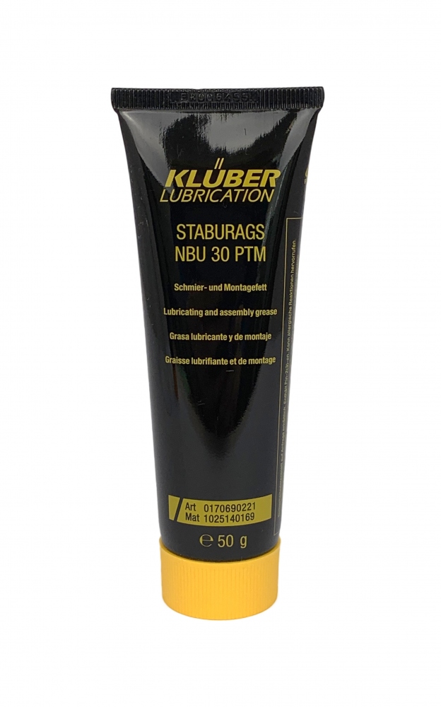 Lubricating and assembly greaseSTABURAGS NBU 30 PTM is an assembly grease containing a solid lubricant. It is resistant to water and protects against tribocorrosion (fretting corrosion). It has proven effective in outdoor applications subject to high humidity.BMW Part Number: 07559056992Content: 50g tubeAvailable in 50g tube, 450g cartridge, 1,2kg can, 30kg bucket, 220kg drumBenefits for your application:Assembly grease protecting against tribo-corrosionGood corrosion protectionExcellent resistance to water even under outdoor conditionsApproved by the company Knorr Bremse, N 12006-37Application:STABURAGS NBU 30 PTM is suitable as an assembly grease for applications incorporating sliding clearance fits. Applications include hot and cold water valves and taps, slideways (especially in filling machines), valve spindles and cylinder guides. The product can also be used as a sealing grease. In addition, it is suitable for the lubrication of slideways, bolts, spindles and screws, e.g. in railway bogie assemblies.STABURAGS NBU 30 PTM is especially suitable for external brake components of rail vehicles, such as bolts and rods.STABURAGS NBU 30 PTM facili-ates assembly and disassembly of ABS sensors in vehicles.Application notes:Use the aerosol spray version of STABURAGS NBU 30 PTM for relubrication of railway brake parts where no grease nipple is incorporated. For optimum penetration into fine clearances we recommend spraying for at least 8 seconds. This will increase efficiency of brake rods in rail vehicles thus ensuring the longest maintenance intervals.When used for assembly and lubricating purposes we recommend the lubricant be lightly applied to the component surfaces via a lint free cloth, by hand, or by brush.STABURAGS NBU 30 PTM shows good adhesive strength at low temperatures down to min. -40 °C.Product data:Article number17069Chemical compositionsolid lubricantChemical composition, thickenerbarium complex soapChemical composition, type of oilmineral oilLower service temperature-10 °C / 14 °FUpper service temperature160 °C / 320 °FColour spacegreyDensity at 20 °Capprox. 1,10 g/cm³Worked penetration, DIN ISO 2137, 25 °C, lower limit value245 x 0,1 mmWorked penetration, DIN ISO 2137, 25 °C, upper limit value275 x 0,1 mmKinematic viscosity of the base oil, DIN 51562 pt. 01/ASTM D-445/ASTM D 7042, 40 °Capprox. 490 mm²/sKinematic viscosity of the base oil, DIN 51562 pt. 01/ASTM D-445/ASTM D 7042, 100 °Capprox. 31 mm²/sShear viscosity at 25 °C, shear rate 300 s-1; equipment:rotational viscometerapprox. 15 000 mPasDrop point, DIN ISO 2176, IP 396>= 220 °CMinimum shelf life from the date of manufacture – in a dry, frost-free place and in the unopened original container, approx.60 Hazard Information (CLP)Signal word: WarningHazard Statements (H-statements)H302: Harmful if swallowed.Precautionary Statements (P-statements)Prevention:P264: Wash skin thoroughly after handling.P270: Do not eat, drink, or smoke when using this product.Response:P301 + P312 + P330: IF SWALLOWED: Call a POISON CENTER/doctor if you feel unwell. Rinse mouth.Additional Labeling (EUH-statements)EUH208: Contains pin-2(3)-ene. May cause allergic reactions.EUH212: Caution! Dangerous respirable dust may be formed when used. Do not breathe dust.Hazard-determining Component(s) for LabelingBarium salts Information on product safety (Manufacturer, Contact)KLÜBER LUBRICATION MÜNCHEN GMBH & CO. KG, Geisenhausenerstraße 7, 81379 München, GERMANY, +49 89 7876 0, , www.klueber.com