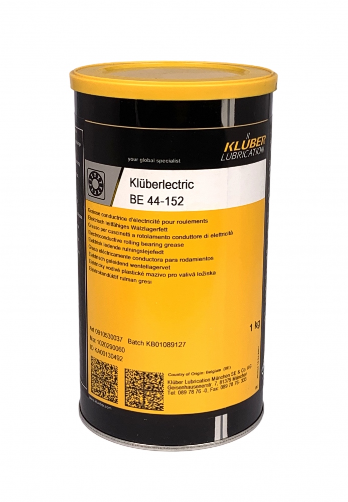Klüberlectric BE 44-152 is a fully synthetic lubricating grease based on a synthetic hydrocarbon oil, lithium soap and dark solid lubricants. Due to its special composition, static electricity in rolling bearings is conducted through the grease, thus preventing local voltage discharge, which would severely damage the bearing raceways and rolling elements.Benefits for your applicationLonger component lifedue to long-term and for-life lubrication of rolling bearings subject to static electricitydue to excellent wear protection based on special additives and solid lubricants Information on product safety (Manufacturer, Contact)KLÜBER LUBRICATION MÜNCHEN GMBH & CO. KG, Geisenhausenerstraße 7, 81379 München, GERMANY, +49 89 7876 0, , www.klueber.com