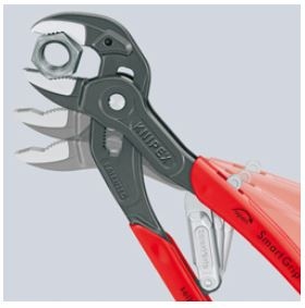 Adjustment to suit the workpiece is automatic with the KNIPEX SmartGrip®! Place the outer jaw on the workpiece, squeeze the handles – turn!Technical SpecificationsPliers grey atramentizedHead polishedHandles with non-slip plastic coatingCapacity for pipes, inches (diameter) 1 1/4 Ø InchCapacities for pipes (diameter) 32 Ø mmCapacities for nuts 36 mmLength 250 mmHighlightsIdeal for service, maintenance and equipment repair, in automotive and general industryLong, narrow jawsParticularly good access to the workpiece due to very slim construction of head and joint areaFirm grip also on flat material due to three-point restPush the button for adjustment on the workpieceFine adjustment for optimum adaptation to different sizes of workpieces and a comfortable handle widthSelf-locking on pipes and nuts: no slipping on the workpiece and low handforce requiredBox-joint design for high stability due to double guideReliable catching of the hinge bolt: no unintentional shiftingFavourable lever action: optimum transmission of forceGuard prevents operators’ fingers being pinchedChrome vanadium electric steel, forged, multi stage oil-hardened Information on product safety (Manufacturer, Contact)KNIPEX-Werk C. Gustav Putsch KG, Oberkamper Strasse 13, 42349 Wuppertal, GERMANY, +49 202 4794-0, , www.knipex.de