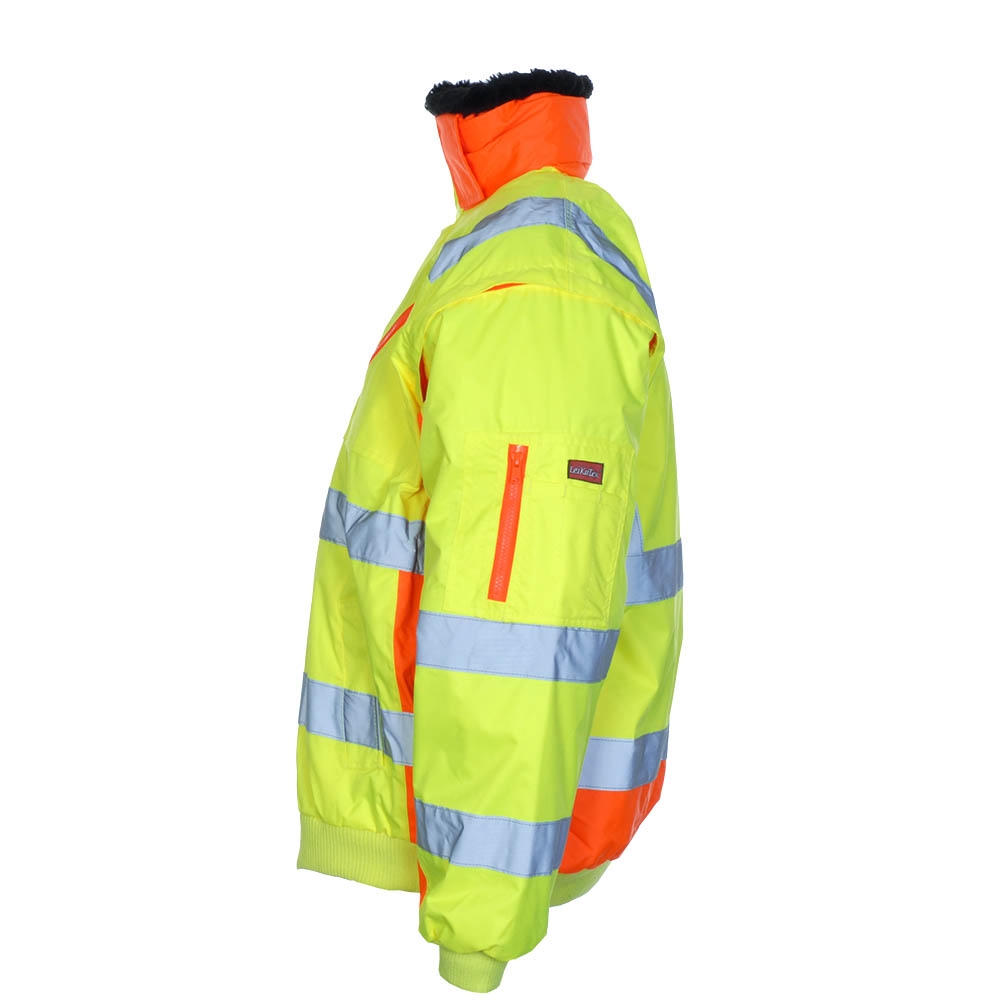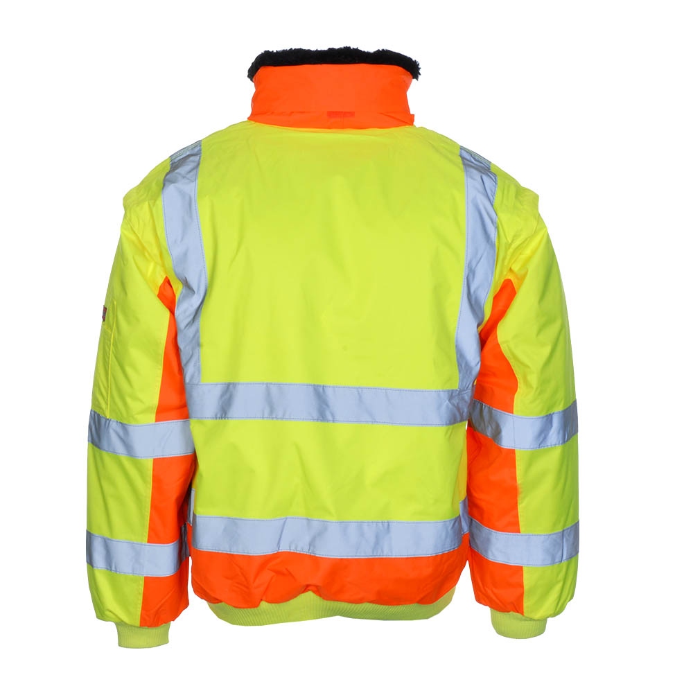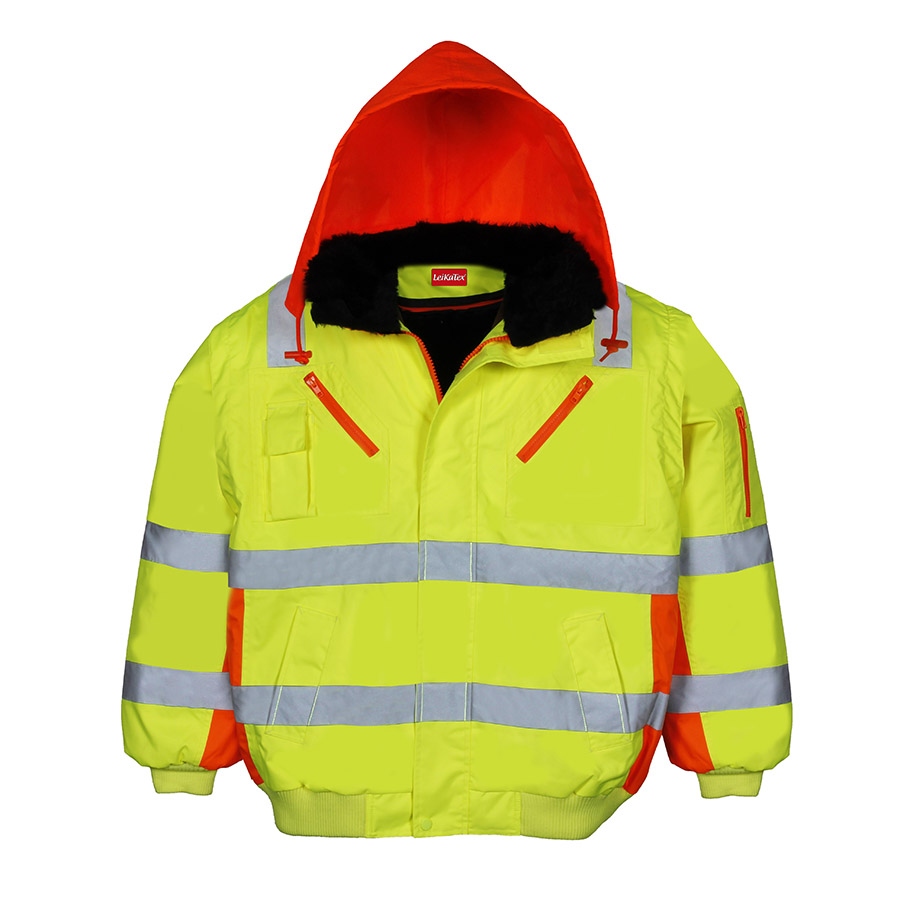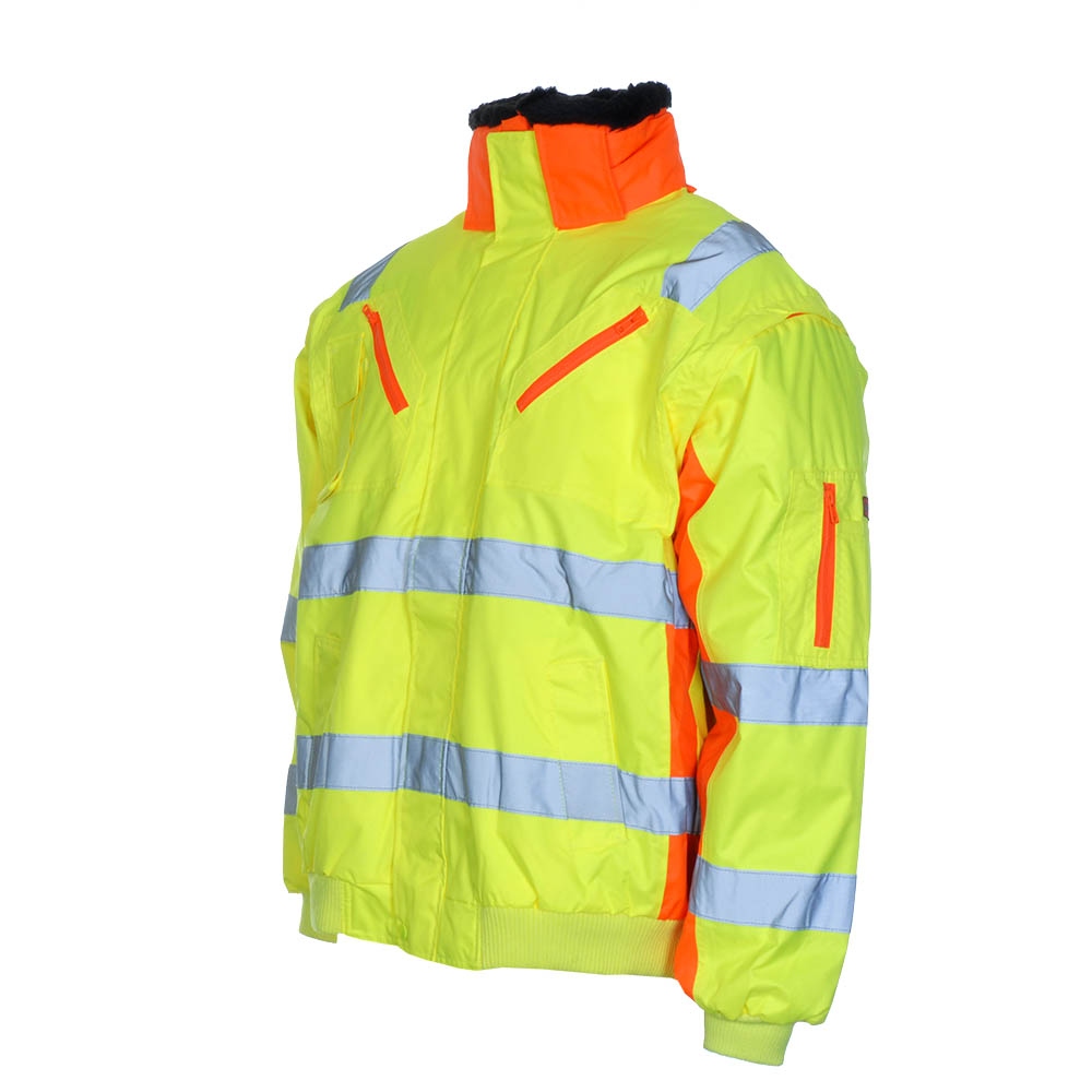 Pilot jacket with removable sleeves and faux-fur collarRemovable polar fleece liningHood in collar rolledMany optimally arranged inner and outer pocketsSleeves with knitted cuffsCovered zipper.Technical specifications EN ISO 20471: 2013 / EN 343: 2003 + A1: 2007Color: Neon yellow/neon orangeLining: 70 % polyester, 30 % polyacrylInside: PU coatedExterior fabrics: 100% Oxford polyesterSizes: S-5XL Information on product safety (Manufacturer, Contact)Richard Leipold GmbH, Industriestraße 1 1, 34260 Kaufungen, GERMANY, +49 5605 9481-0, , www.richard-leipold.de
