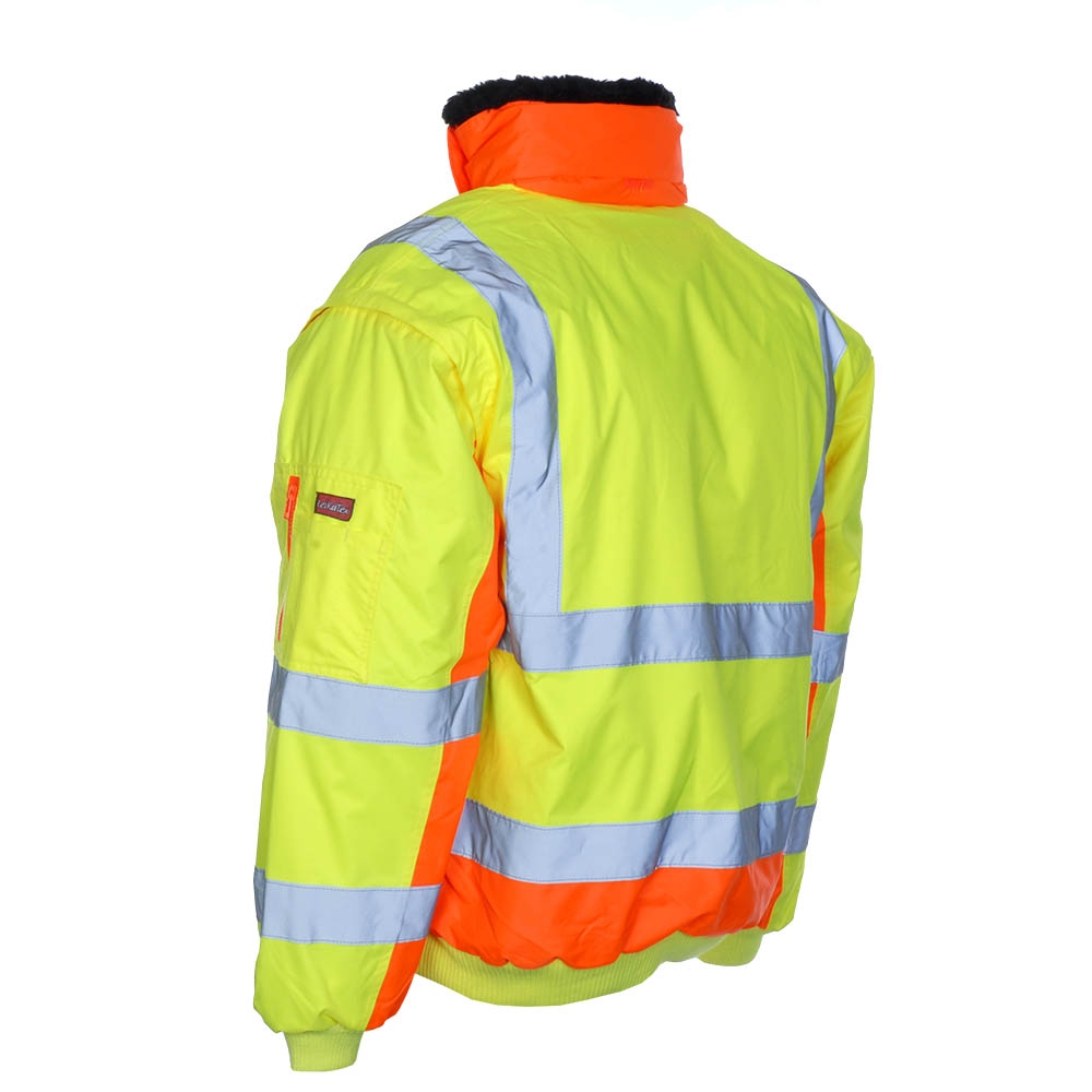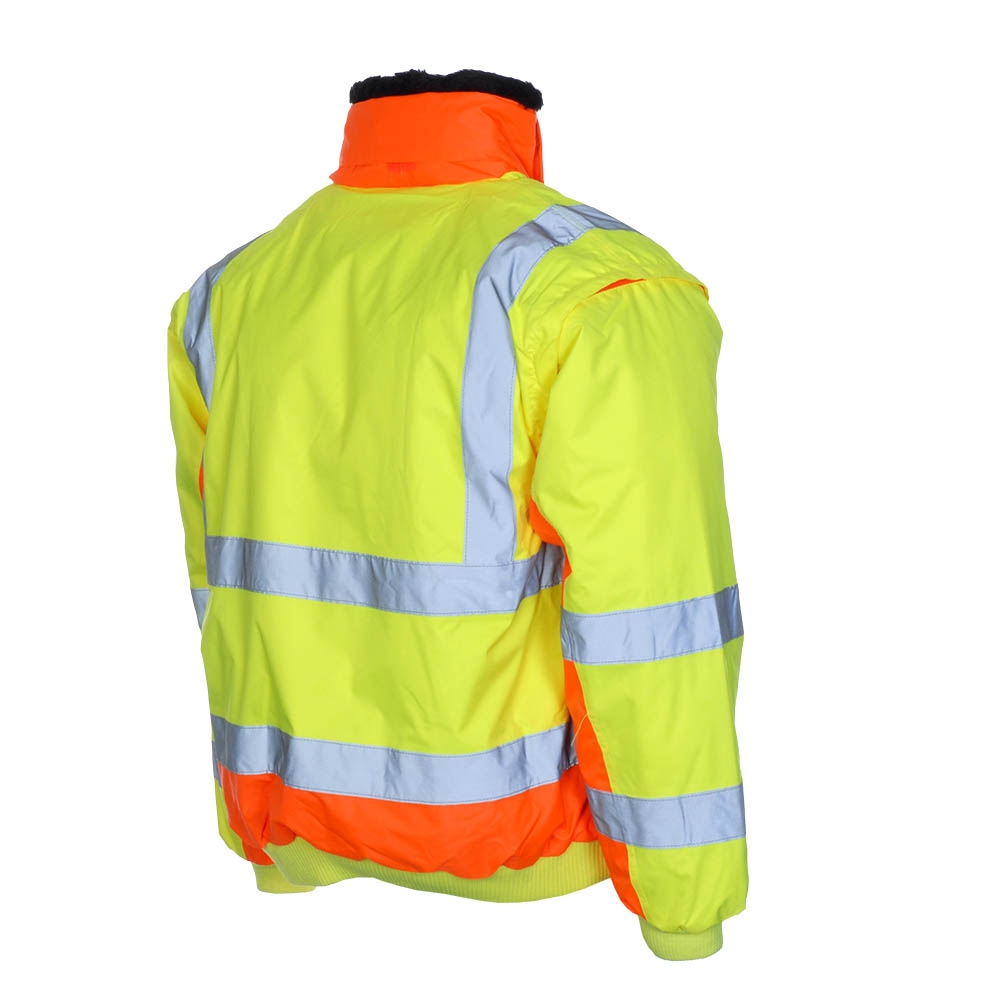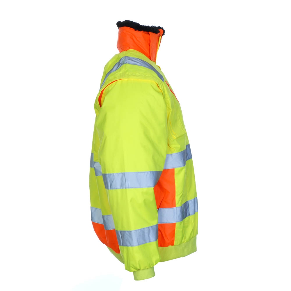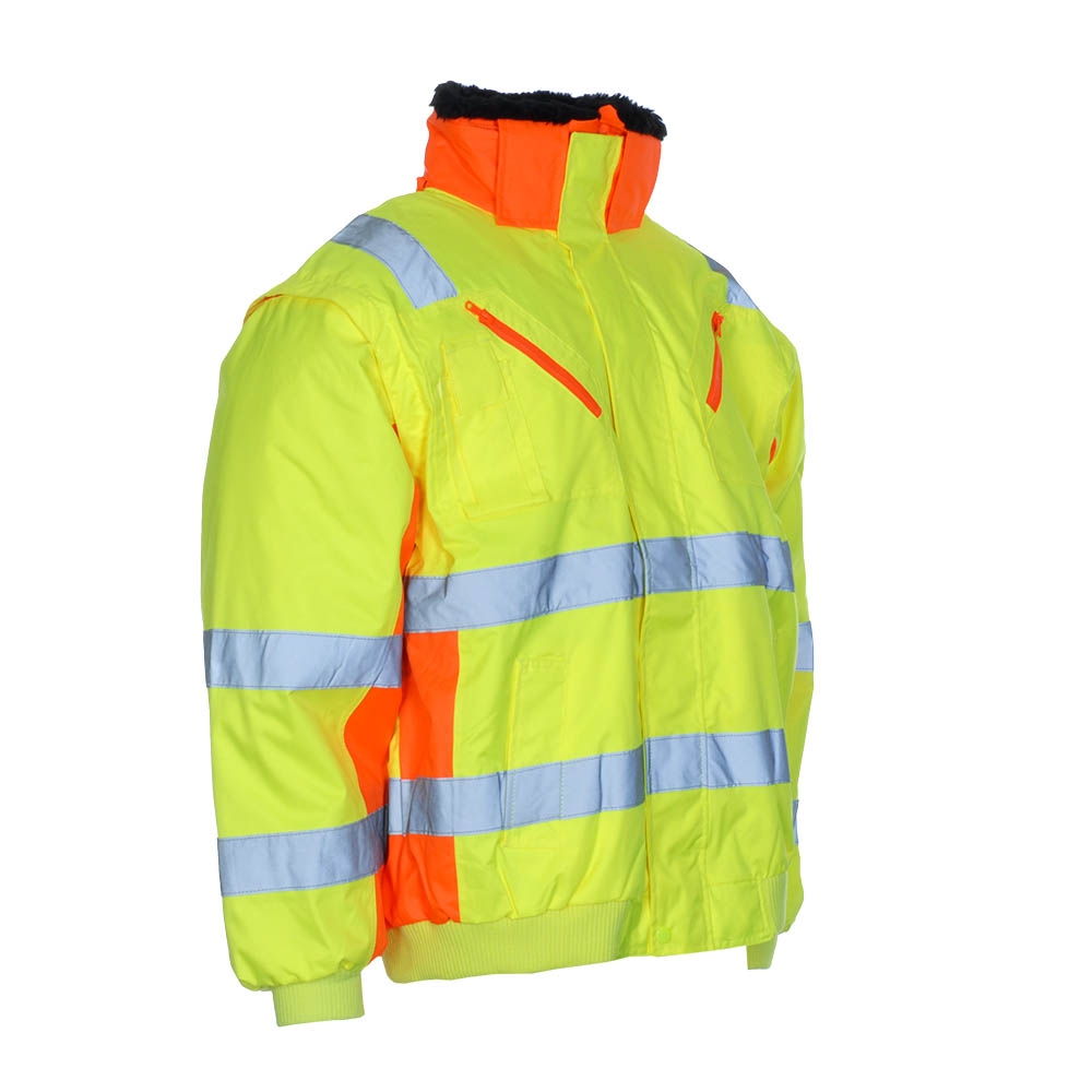Pilot jacket with removable sleeves and faux-fur collarRemovable polar fleece liningHood in collar rolledMany optimally arranged inner and outer pocketsSleeves with knitted cuffsCovered zipper.Technical specifications EN ISO 20471: 2013 / EN 343: 2003 + A1: 2007Color: Neon yellow/neon orangeLining: 70 % polyester, 30 % polyacrylInside: PU coatedExterior fabrics: 100% Oxford polyesterSizes: S-5XL Information on product safety (Manufacturer, Contact)Richard Leipold GmbH, Industriestraße 1 1, 34260 Kaufungen, GERMANY, +49 5605 9481-0, , www.richard-leipold.de